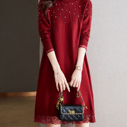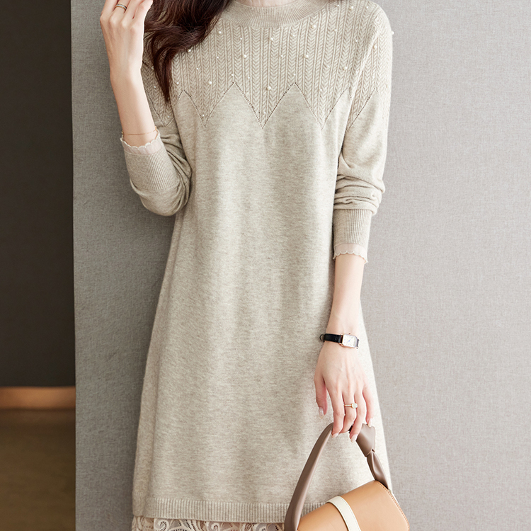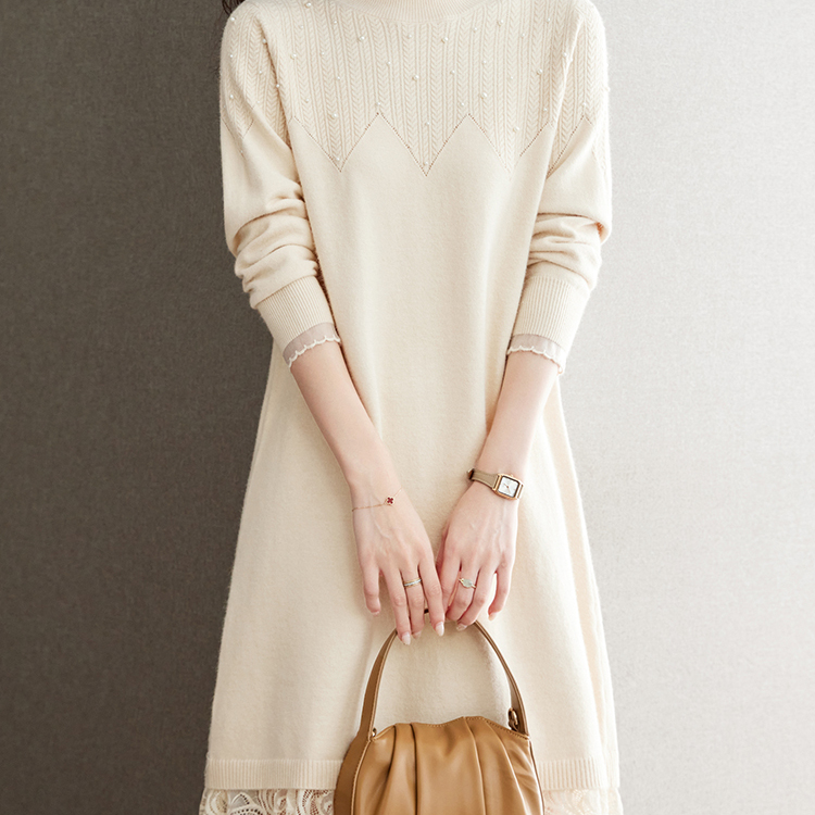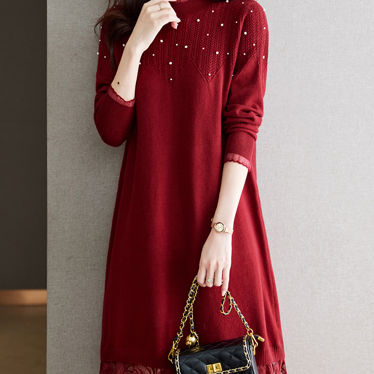 秋冬新款针织连衣裙女羊毛衫中长款小个子打底蕾丝年轻妈妈毛衣裙