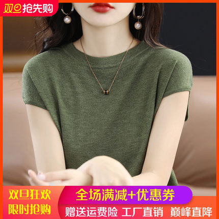 24夏季薄款精纺羊毛针织短袖T恤女宽松半高领打底衫纯色上衣半袖