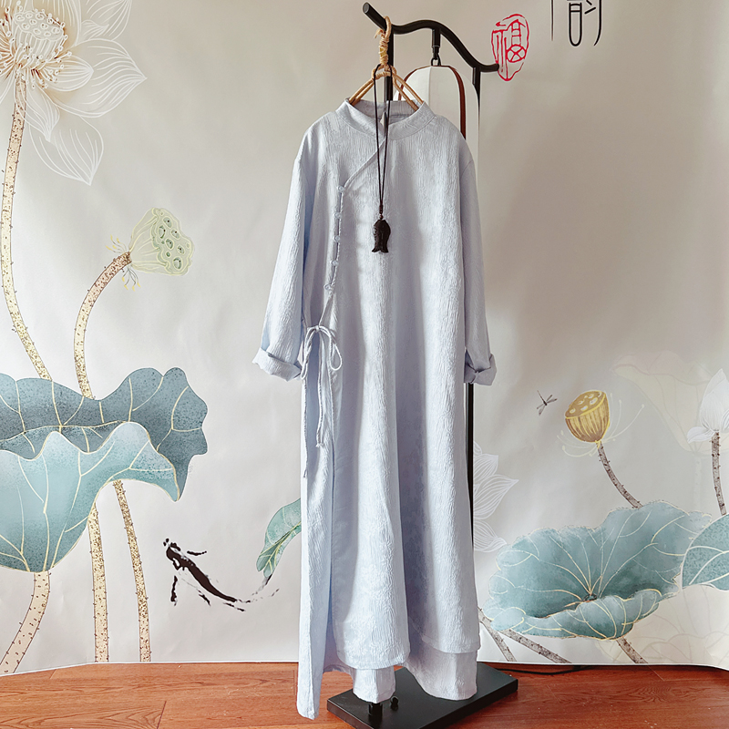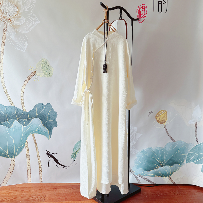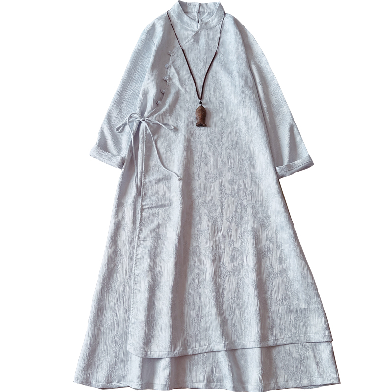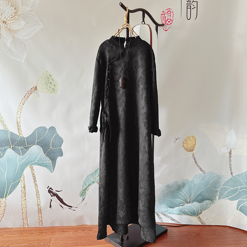 新中式复古文艺提花连衣裙女长袖秋装禅意茶服袍子中国风旗袍长裙