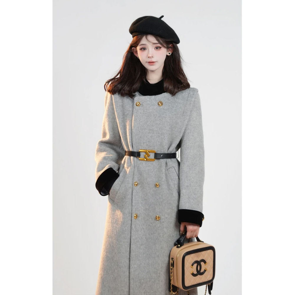 苏黎世的冬 秋冬新款法式赫本毛呢外套高级拼接双排扣中长款大衣