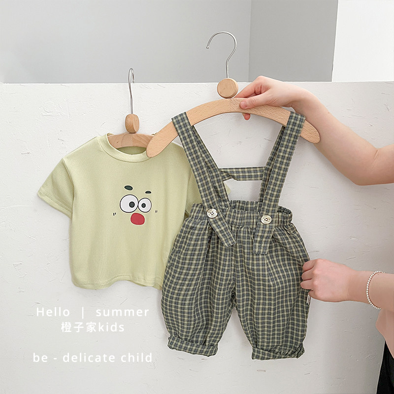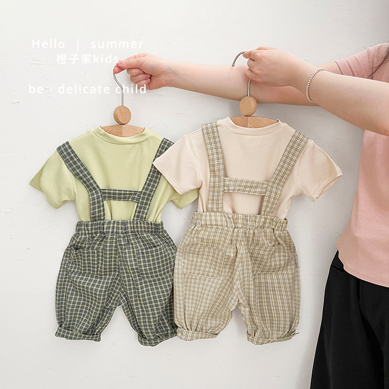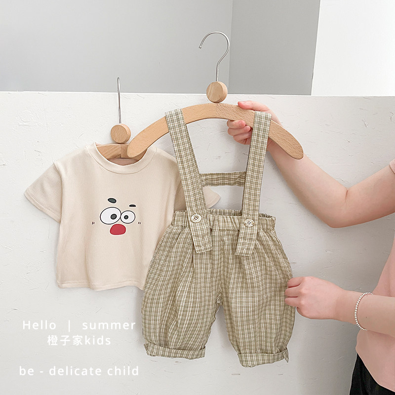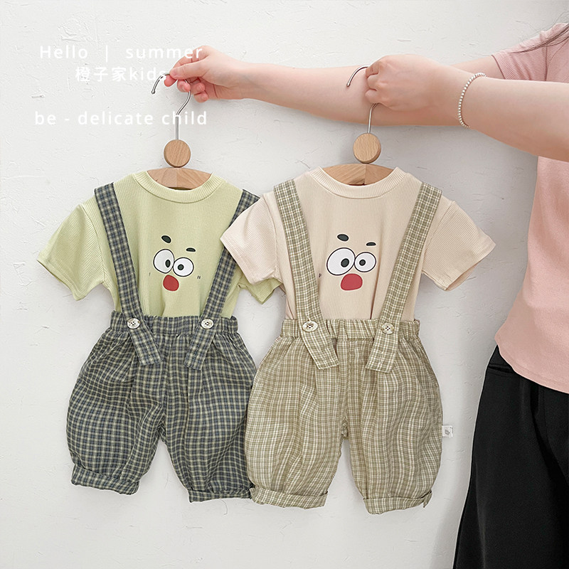 男童夏季薄款超萌背带裤套装婴儿可爱卡通短袖宝宝休闲格子连体裤