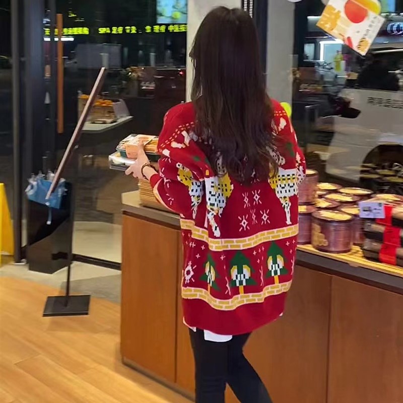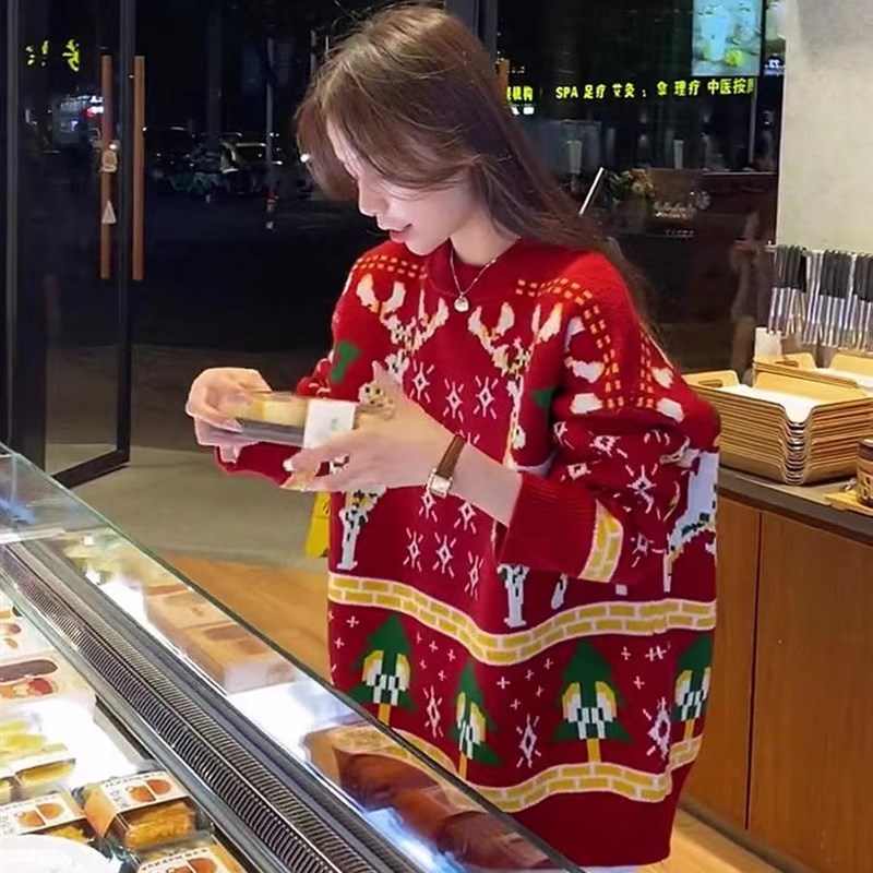 圣诞节亲子装秋冬季红色毛衣2023新款一家三四口母女针织衫外套
