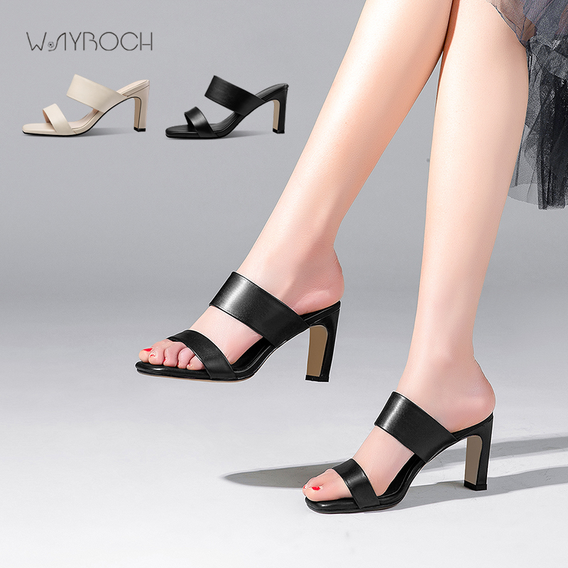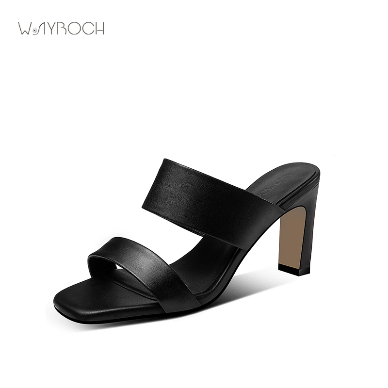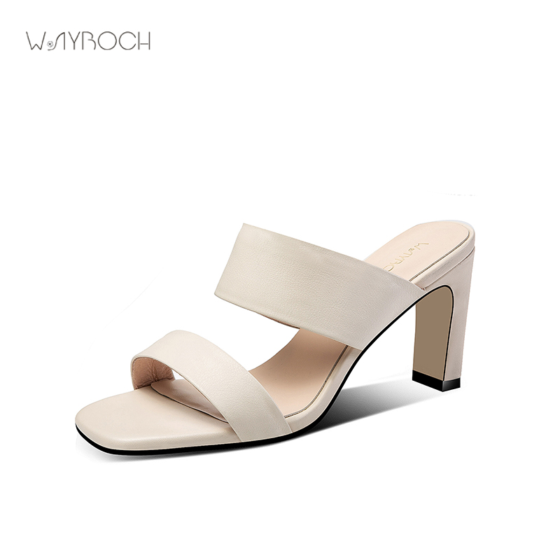 真皮一字带凉拖鞋 高跟粗跟时装凉鞋凉拖 夏季新款女士外穿半托鞋