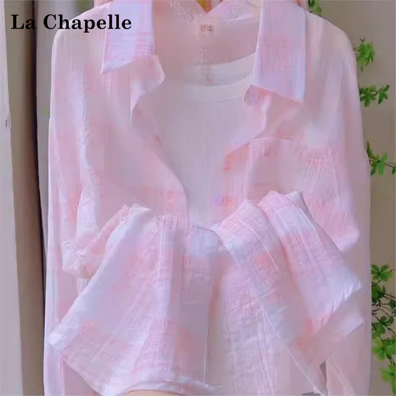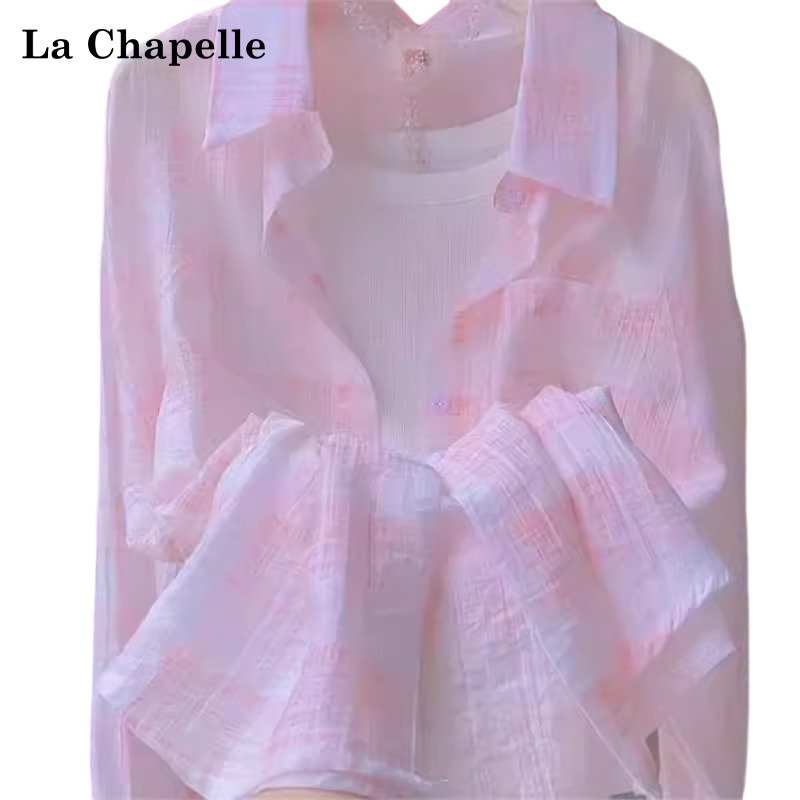 拉夏贝尔粉色高级长袖格子衬衫女夏时尚宽松百搭薄款冰丝防晒外套