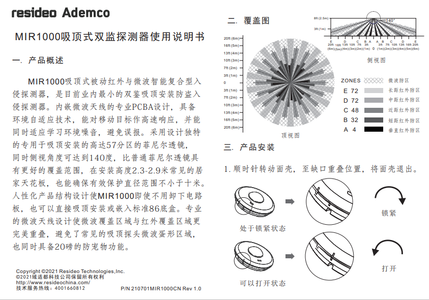 resideo霍尼韦尔Ademco域适都MIR1000吸顶式红外微波双鉴探测器