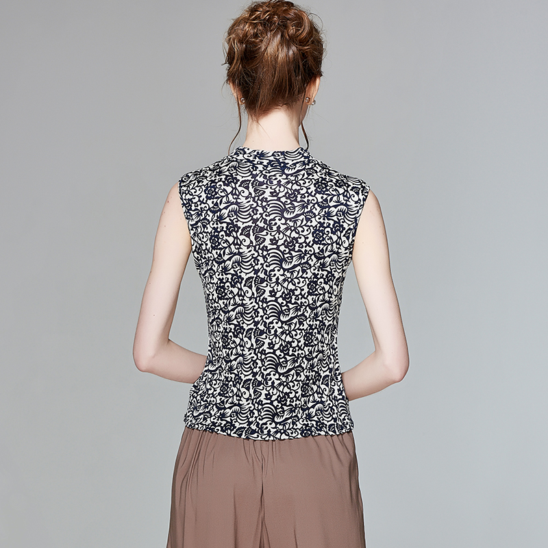 弹力针织真丝印花T恤女2025夏季新款桑蚕丝半高领无袖修身上衣