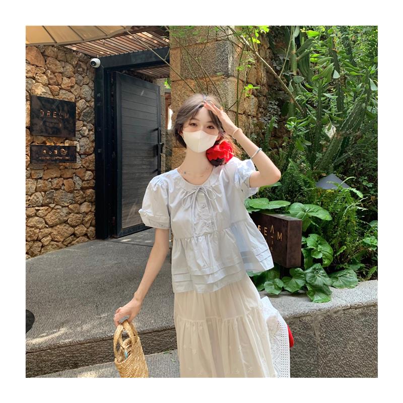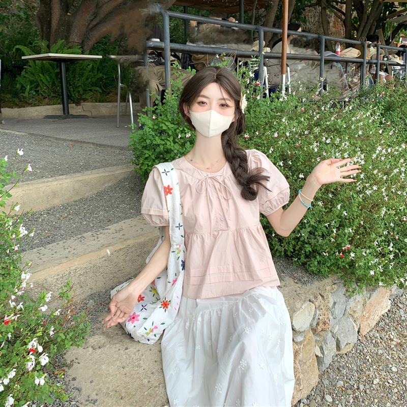 法式棉麻短袖上衣女夏季2025新款漂亮小个子娃娃衫泡泡袖短款T恤