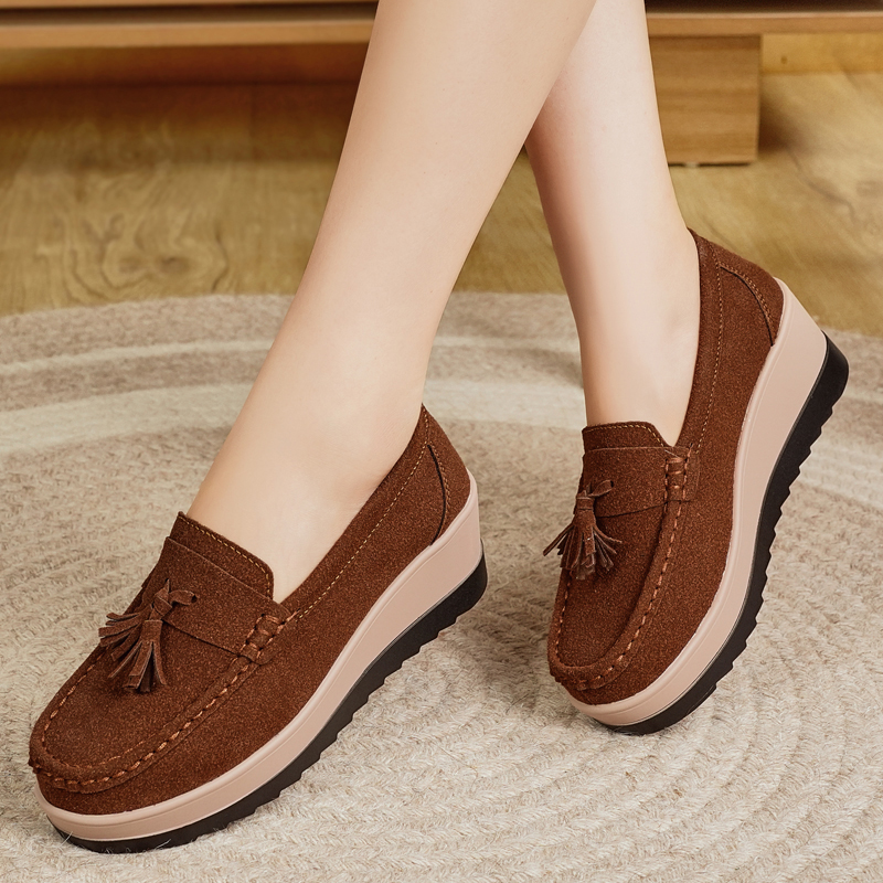 反绒皮松糕底一脚蹬中年妈妈休闲鞋防滑软底舒适套脚乐福鞋女显瘦