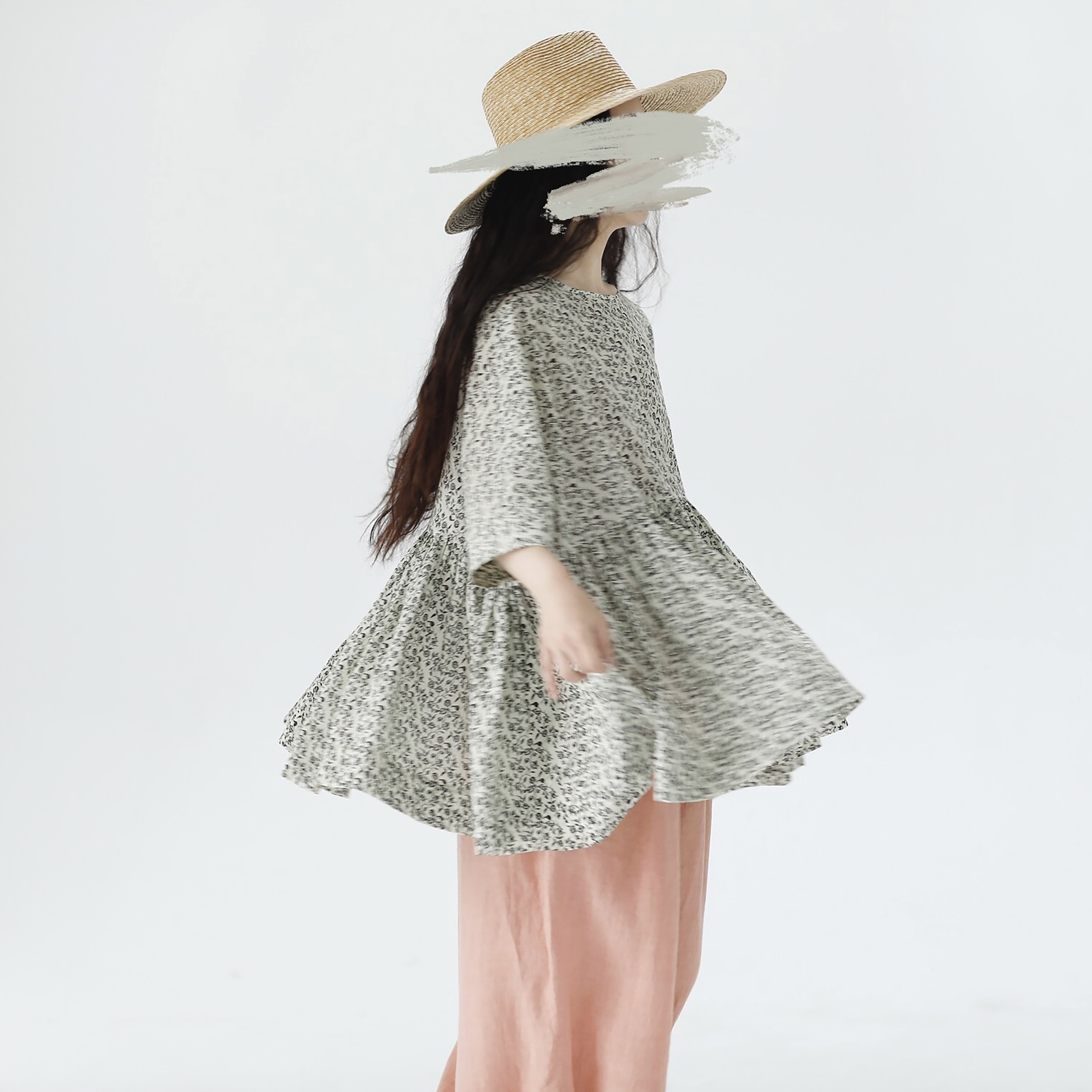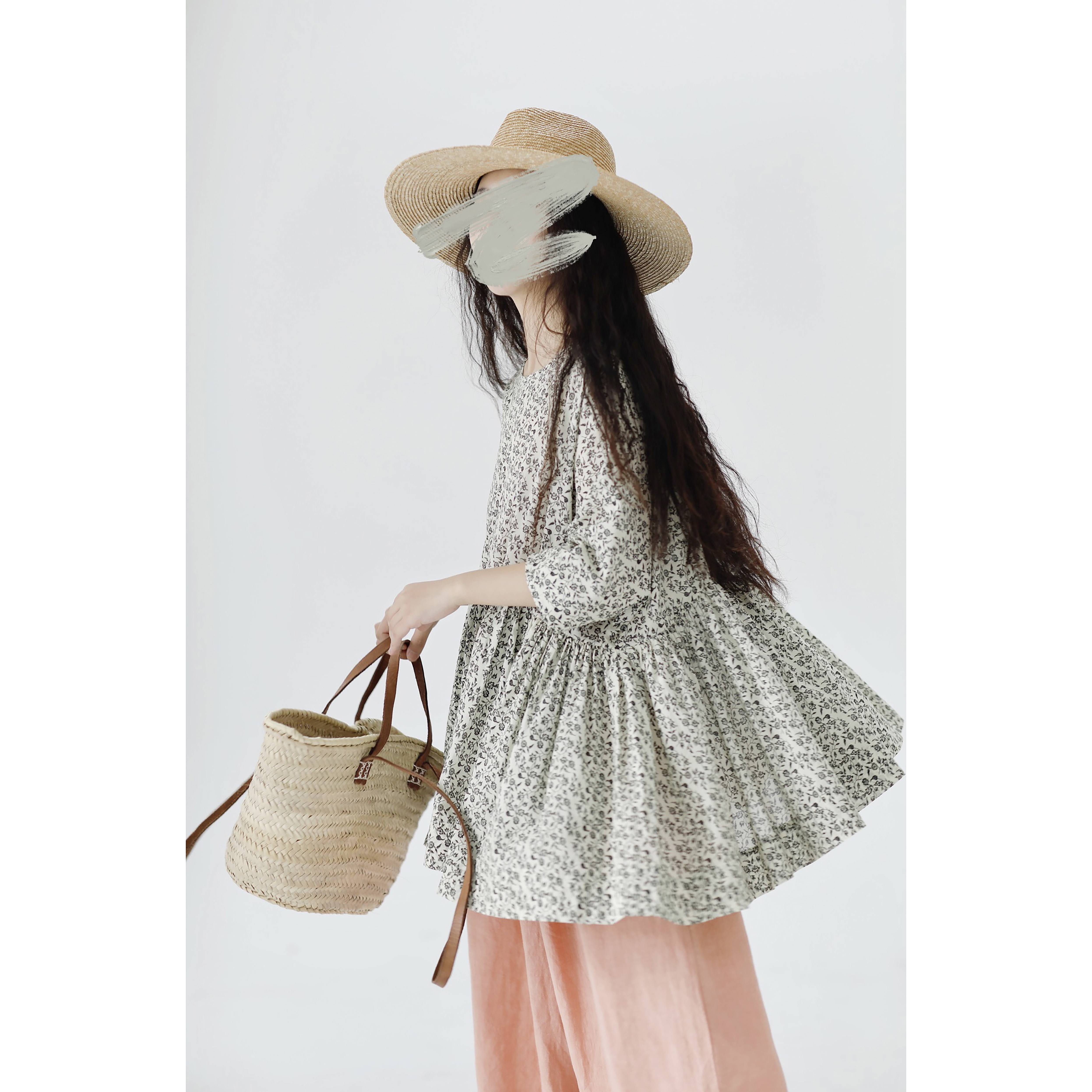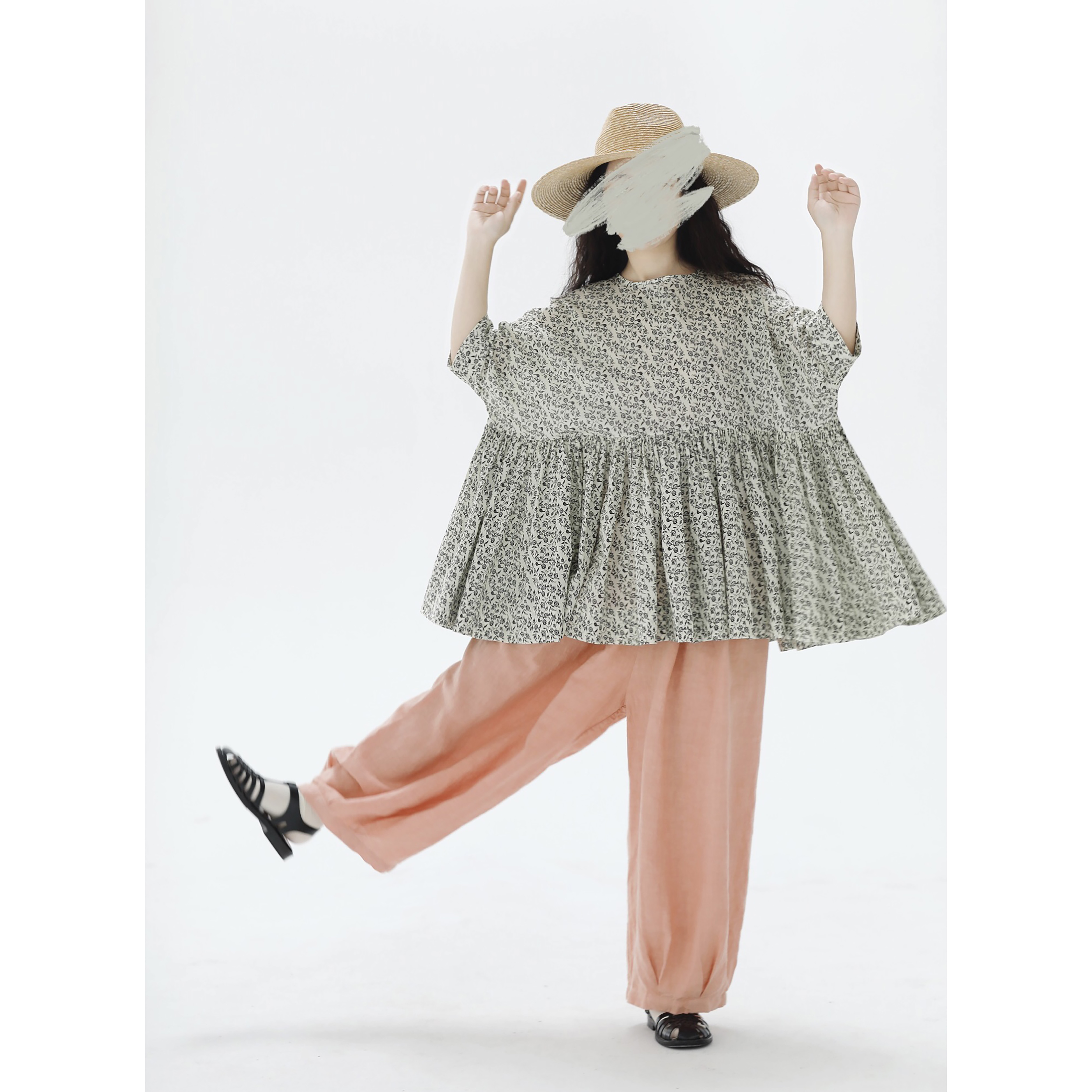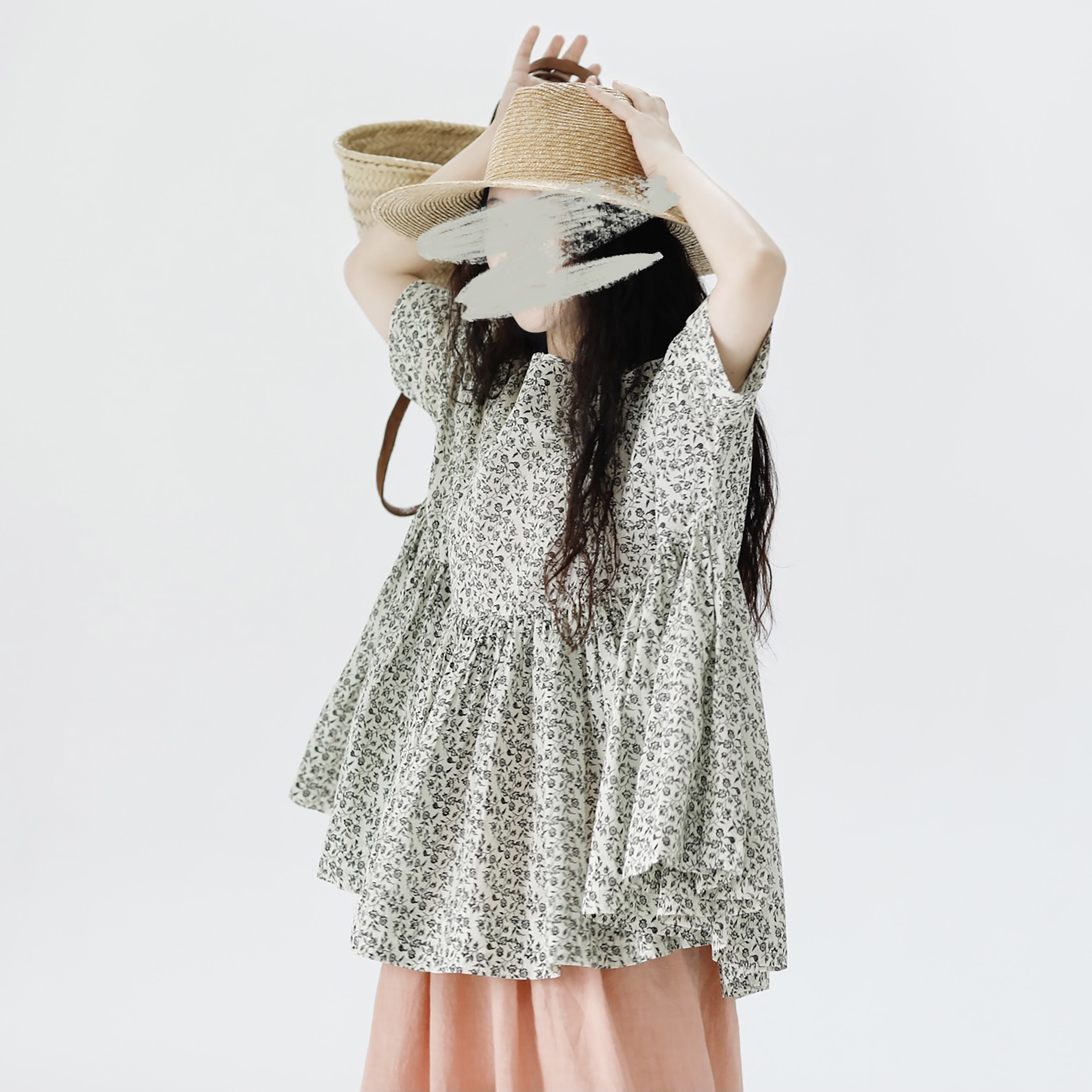 复述全棉小碎花上衣女夏季文艺感复古多褶大摆素色七分短袖娃娃衫