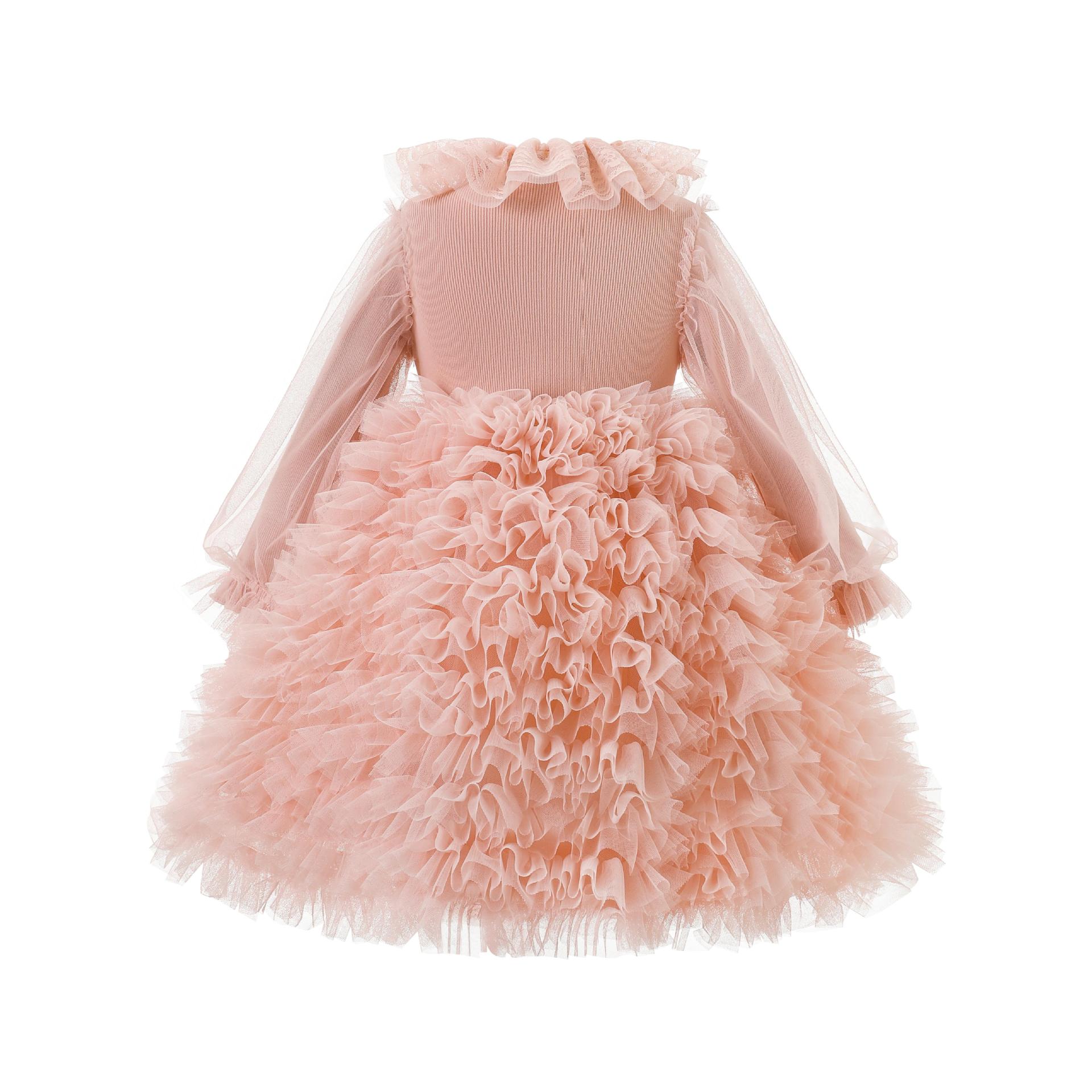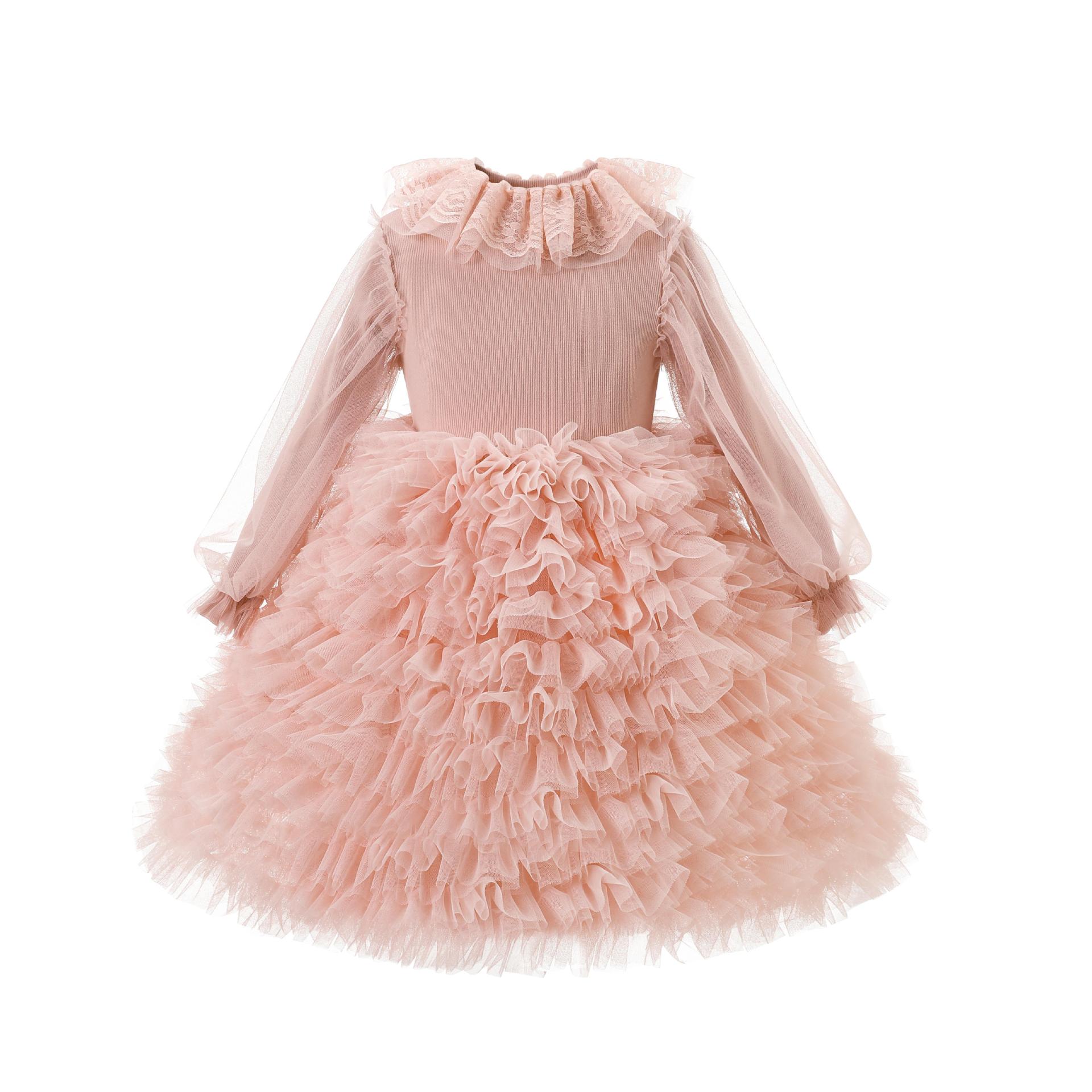 粉色针织毛衣连衣裙长袖蕾丝网纱公主裙女宝长袖蓬蓬纱蛋糕裙秋冬