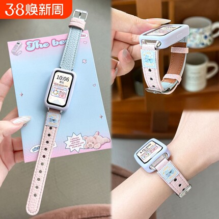 适用华为手环10表带新款9秋冬可爱猫布贴撞色荔枝纹皮质8创意7荣耀简约透气运动女百搭白色粉色