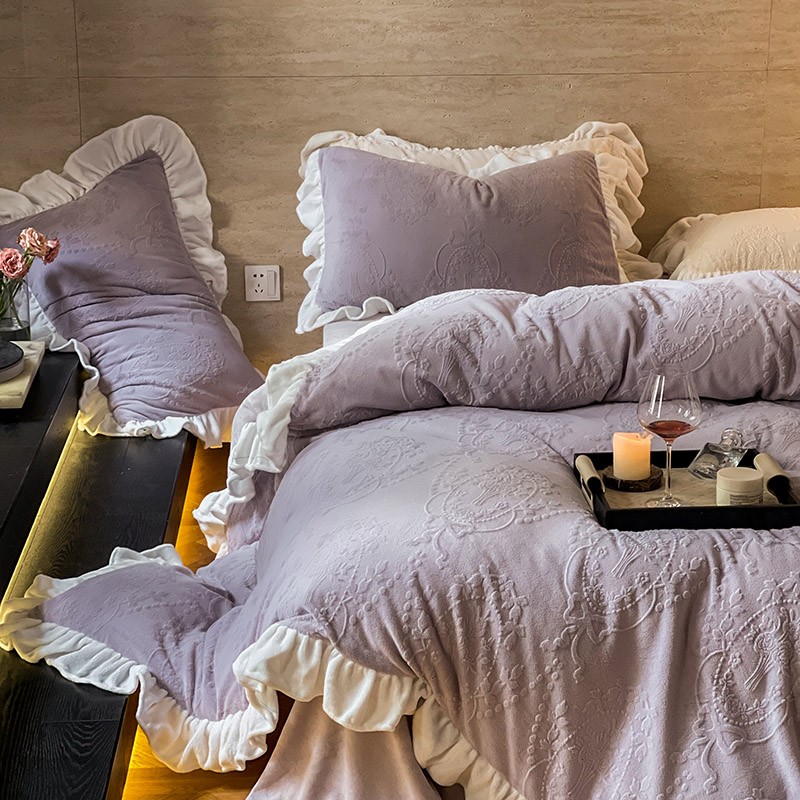 月光巴士法式纯色牛奶绒床上三四件套保暖雕花被套床单床笠珊瑚绒
