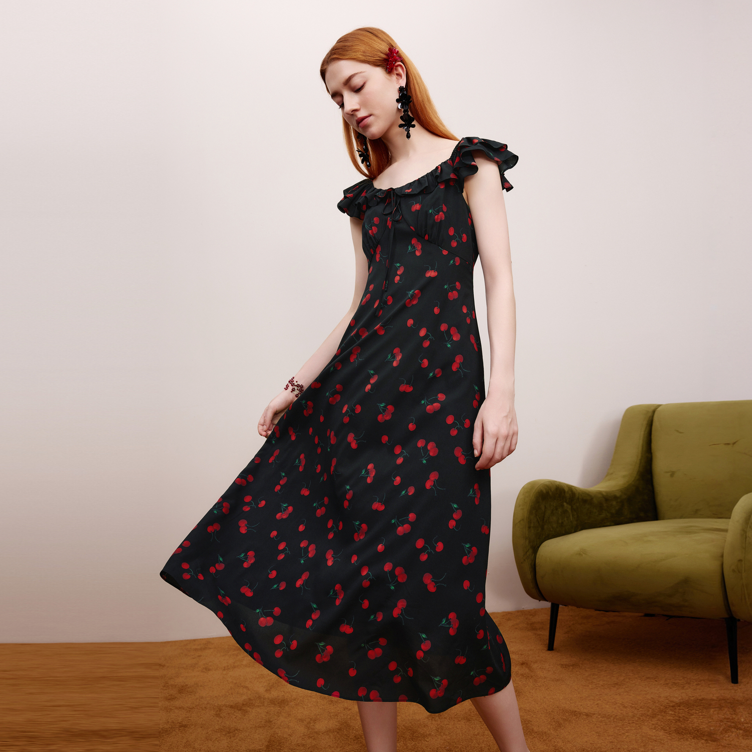 莱茵福莱尔气质连衣裙女夏巨好看的小众掐腰荷叶领小樱桃碎花裙