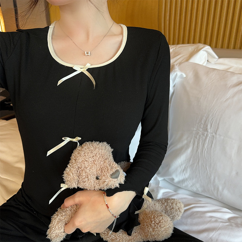 猫人女士睡衣春秋款长袖休闲套头带胸垫家居服圆领套装莫代尔简约