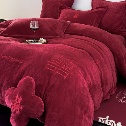 秋冬珊瑚绒四件套红色婚庆牛奶绒被套加厚保暖珊瑚绒结婚床上用品