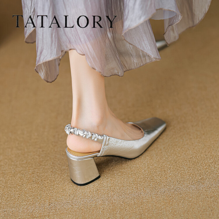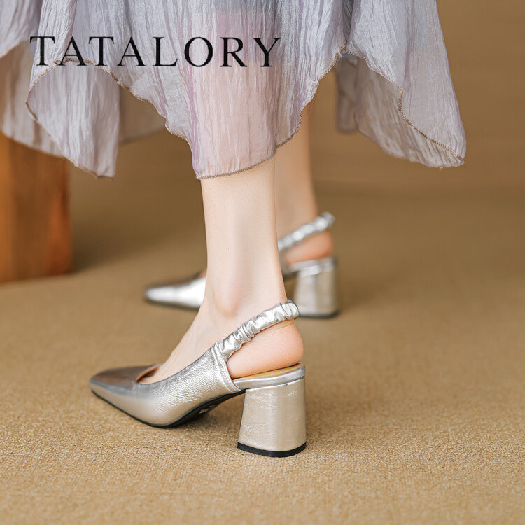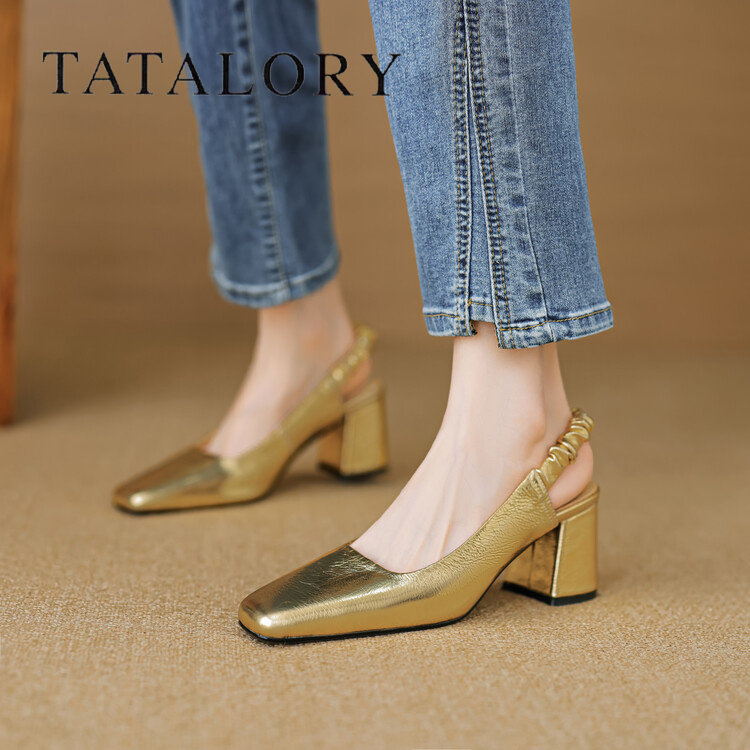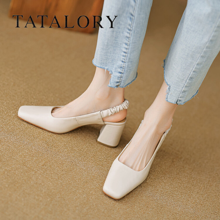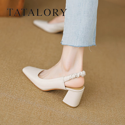 TATALORY女鞋真皮粗跟气质单鞋方头后空高跟鞋通勤简约凉鞋法式