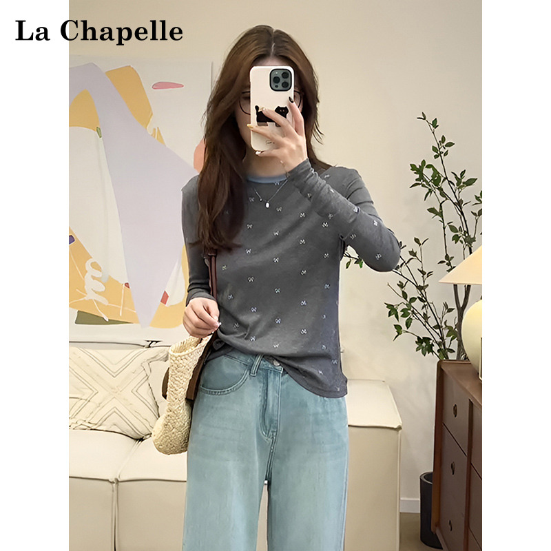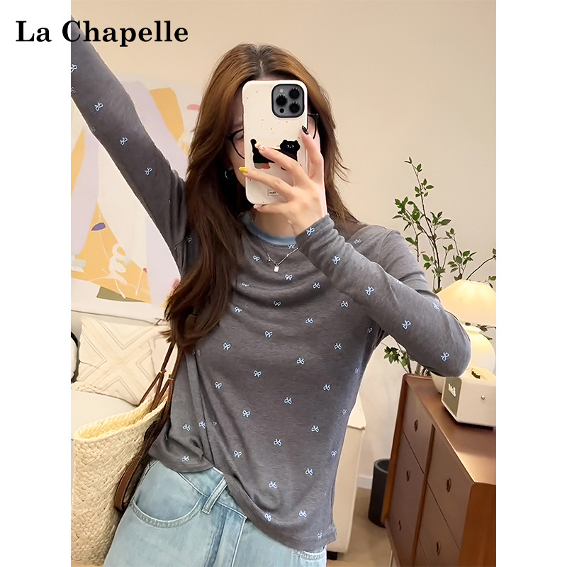 拉夏贝尔欧货圆领蝴蝶结打底衫女秋季宽松长袖T恤小香风内搭上衣