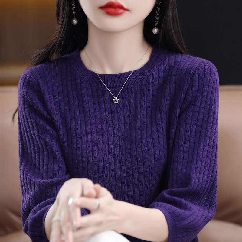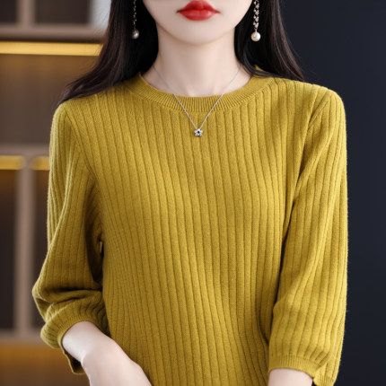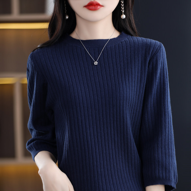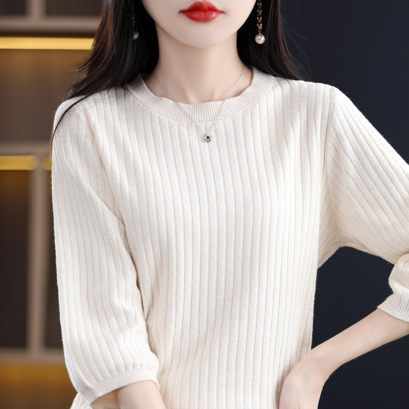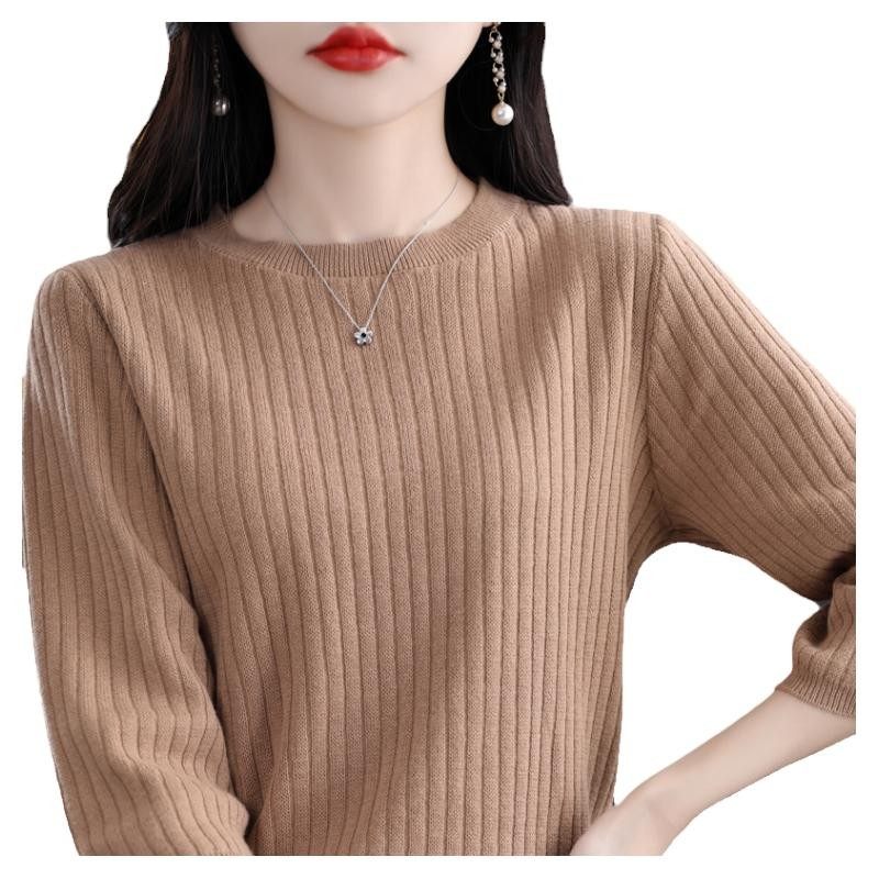 23春季新款纯棉七分袖打底针织衫女圆领套头中袖毛衣宽松棉麻上衣