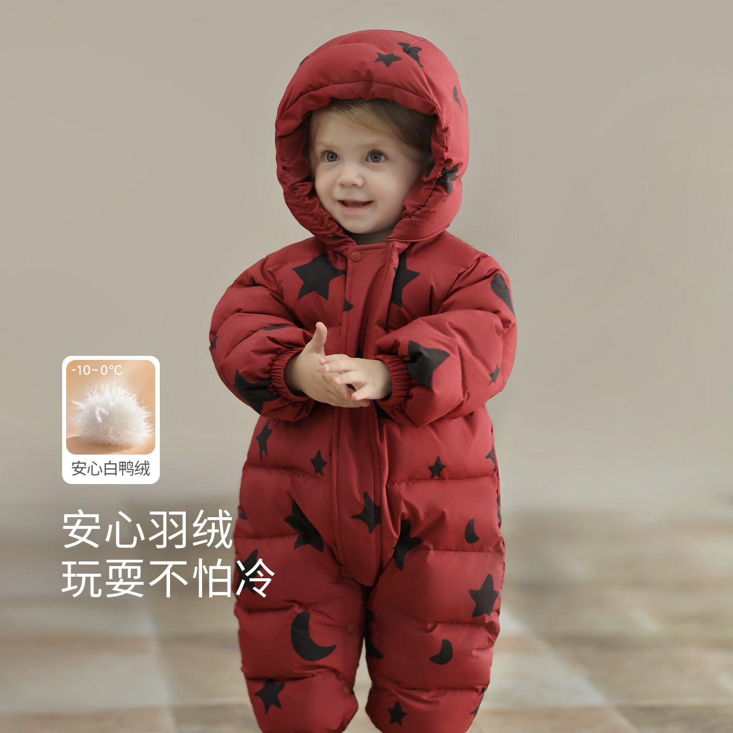 婴儿羽绒服连体衣冬季加厚保暖白鸭绒外出服冬装红色宝宝新年服