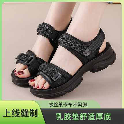 上线缝制夏季运动凉鞋女外穿厚底松糕底魔术贴防滑百搭水钻沙滩鞋