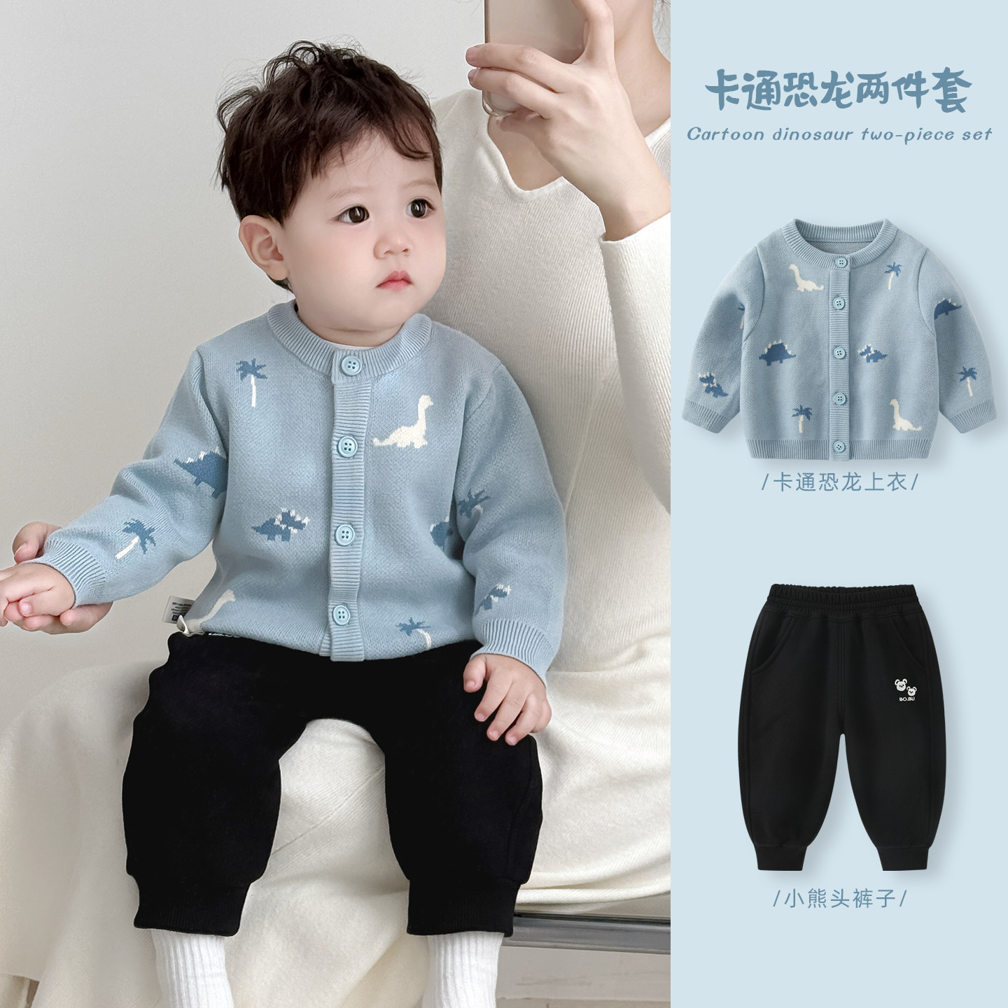 波步婴儿秋冬套装男宝宝冬装加绒加厚毛衣针织外套男童洋气三件套