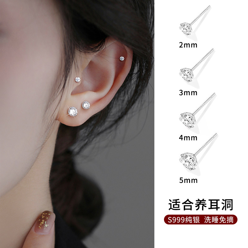 999纯银养耳洞钻石耳钉女迷你小耳环男防堵针耳骨钉耳棒气质耳饰