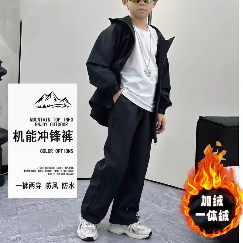 男童裤子秋冬加绒户外防水防风工装裤中大童一体绒休闲裤黑色冲锋