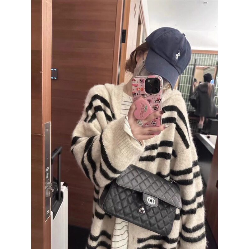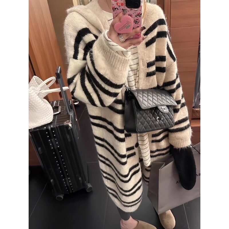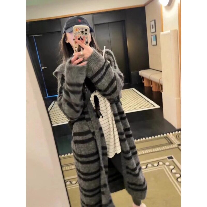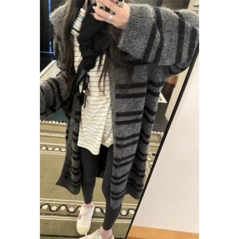 韩系慵懒复古条纹连帽针织开衫女秋冬宽松软糯长款毛衣外套