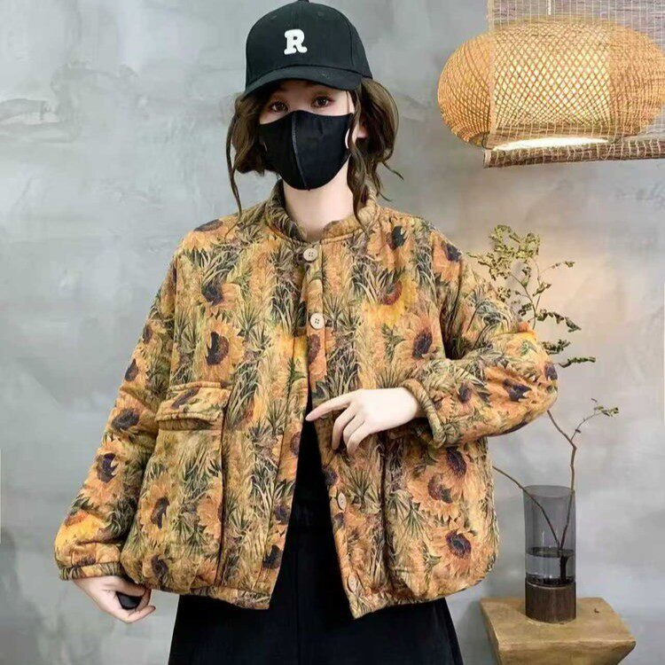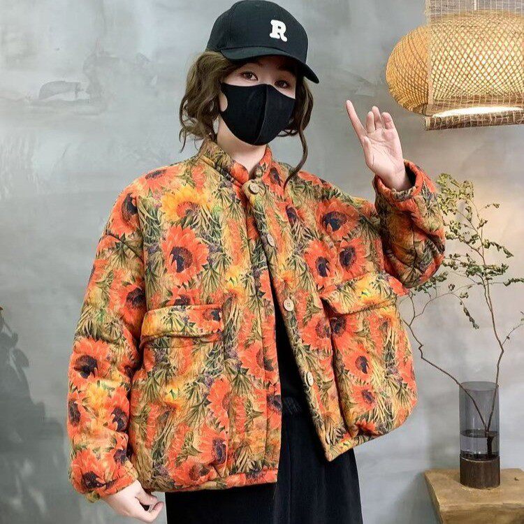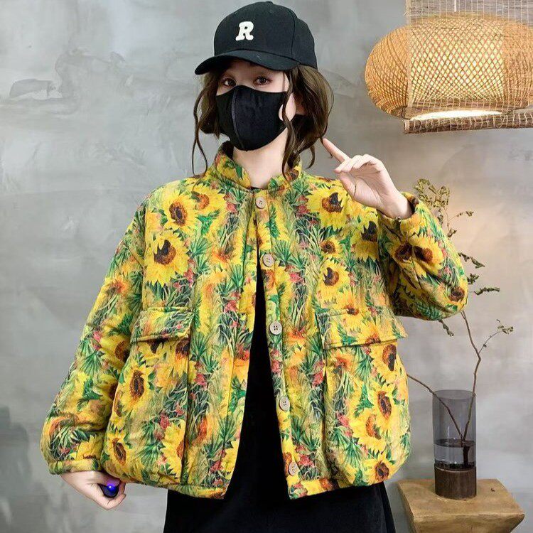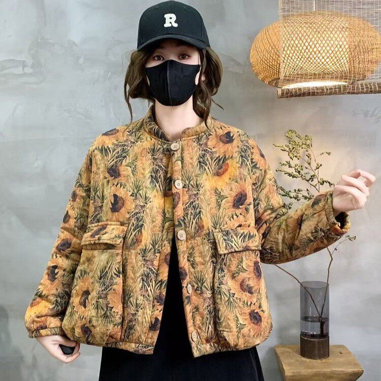 民族风向日葵印花棉衣女宽松立领冬款加绒加厚大口袋棉服保暖外套