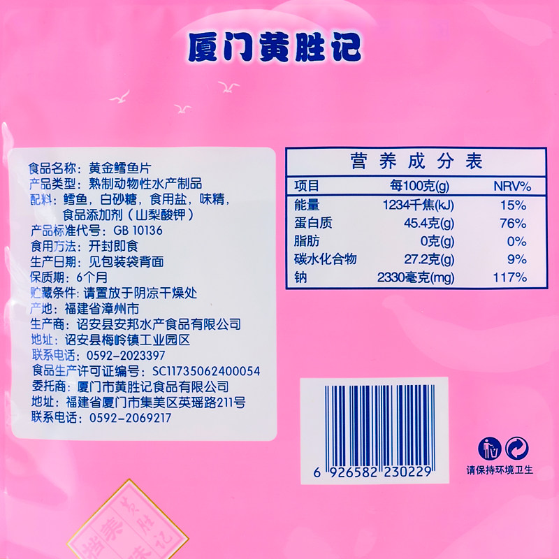 黄胜记黄金鳕鱼片鱼片58g无淀粉