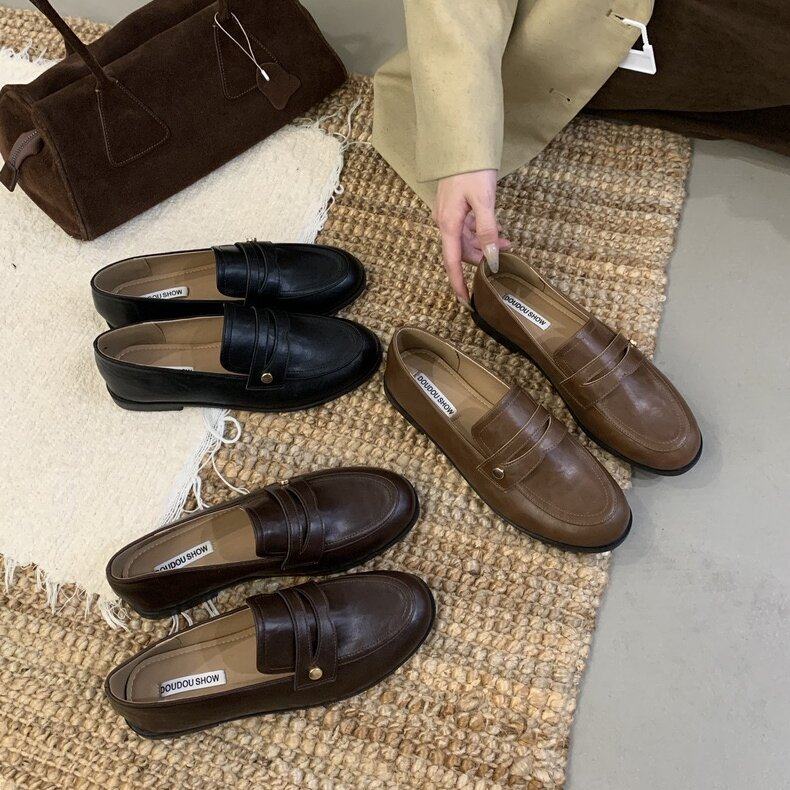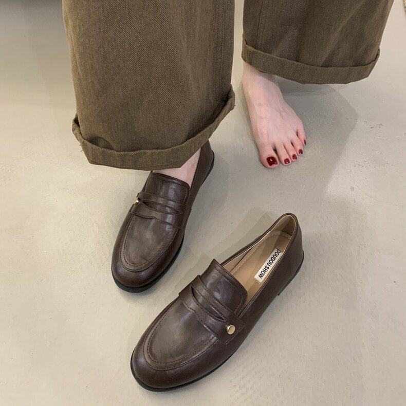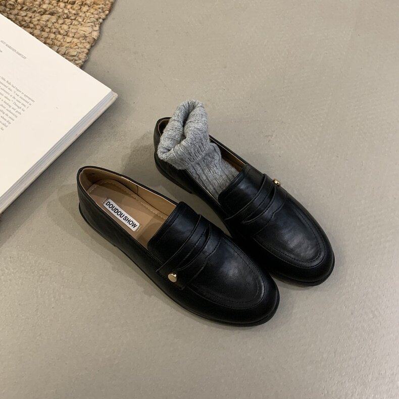 DOUDOUSHOW 复古英伦风百搭小金扣低跟乐福单鞋圆头一脚蹬小皮鞋