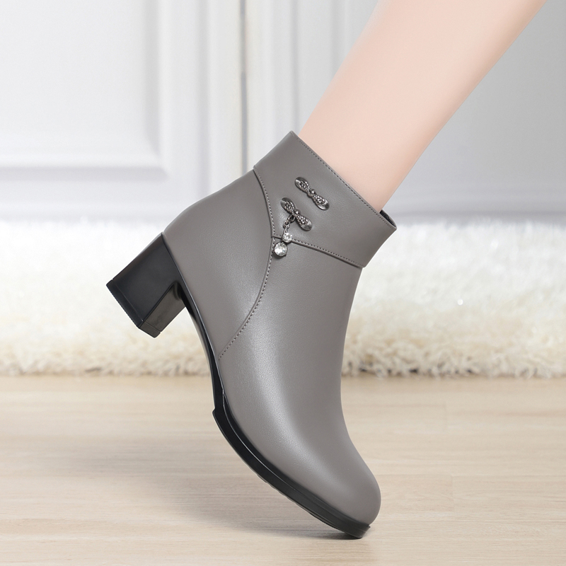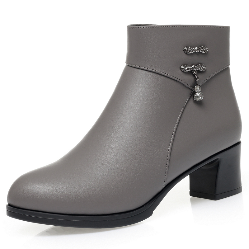 秋冬季短靴中跟妈妈真皮女靴中年皮靴粗跟加绒羊毛棉鞋大码41-43