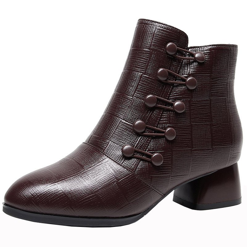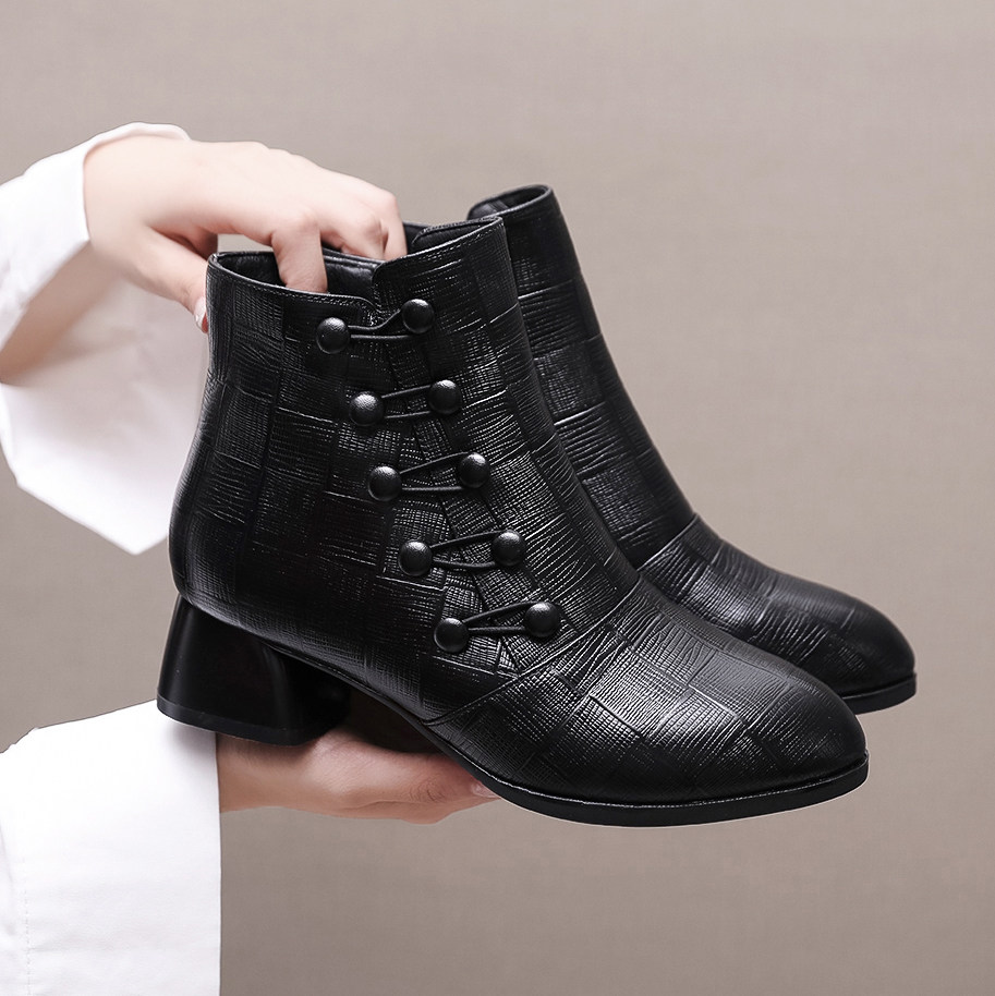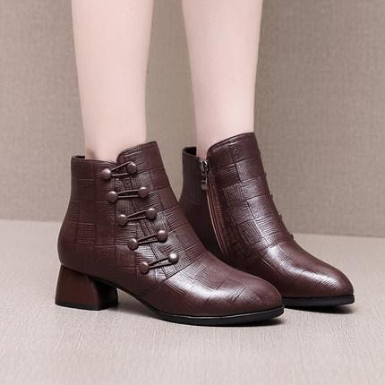 中跟短靴女春秋单靴2025秋冬新款真皮粗跟软底大码中年妈妈棉鞋冬