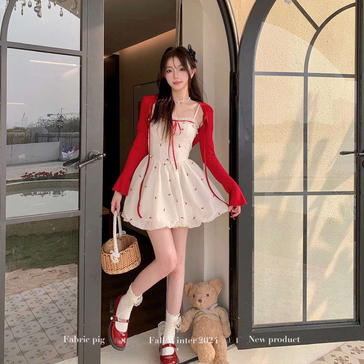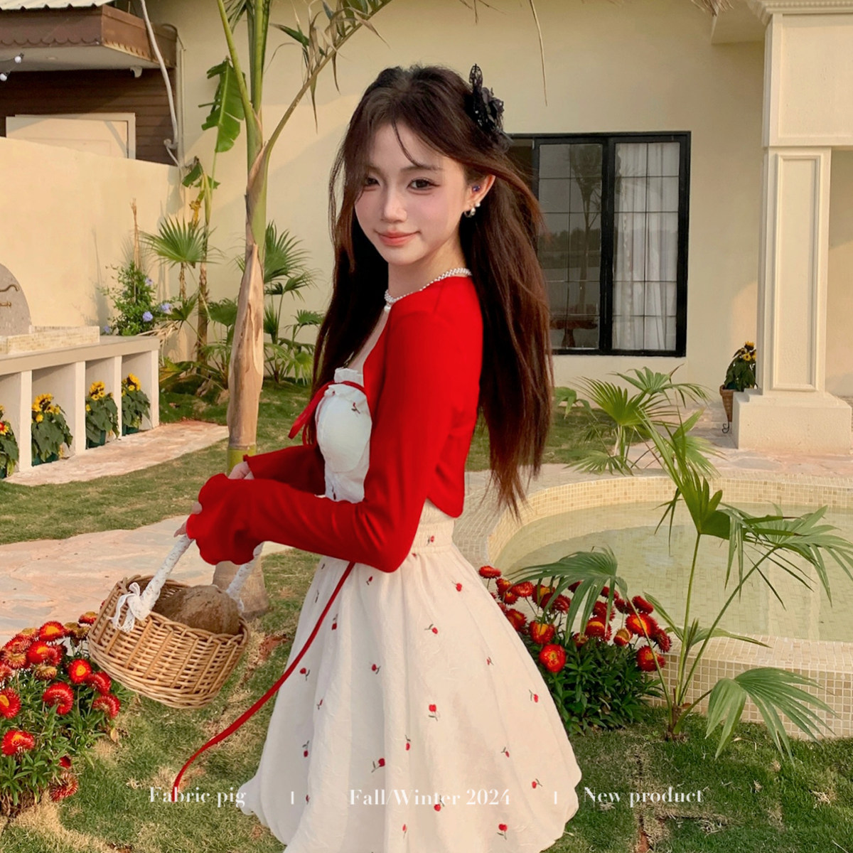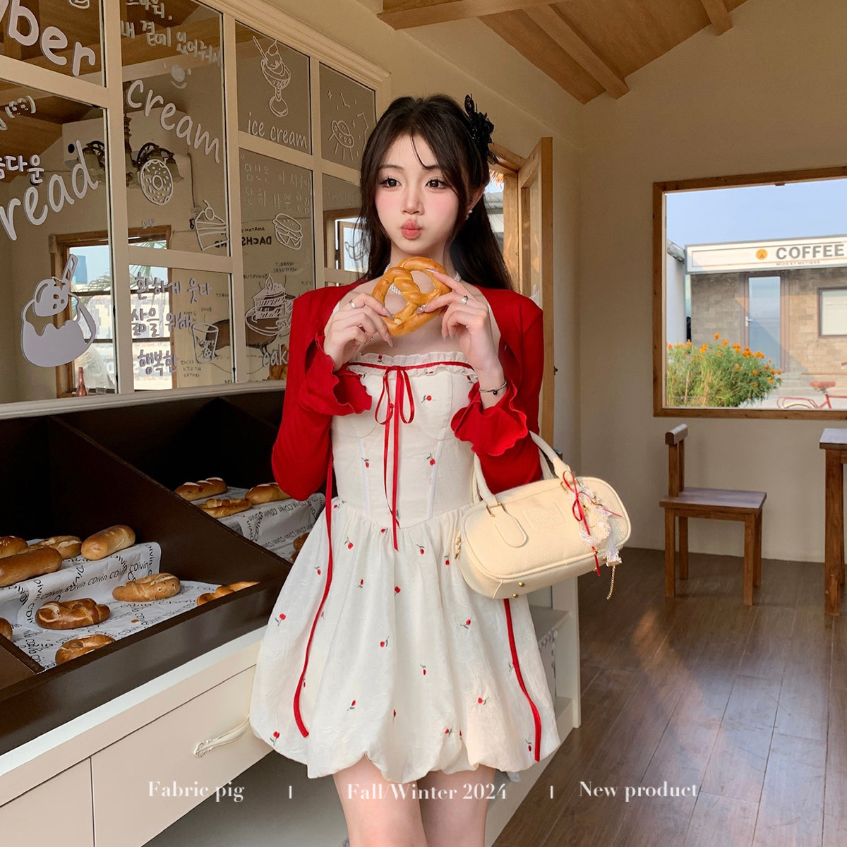 织物猪 松风茶韵 甜欲风红色碎花吊带裙女早秋收腰法式花苞短裙子