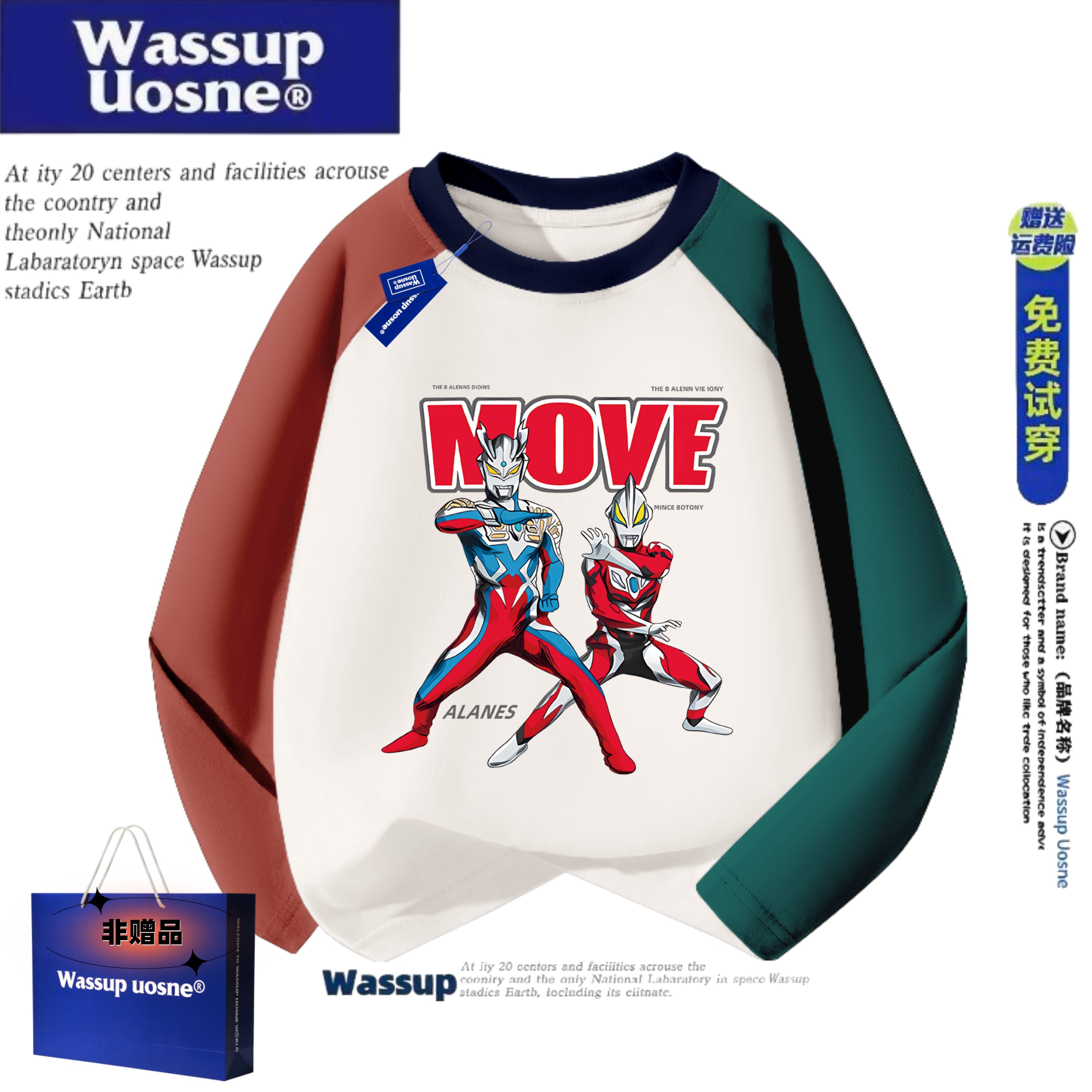 WASSUP联名奥特曼纯棉长袖T恤男童秋季新款帅气炸街插肩打底衫