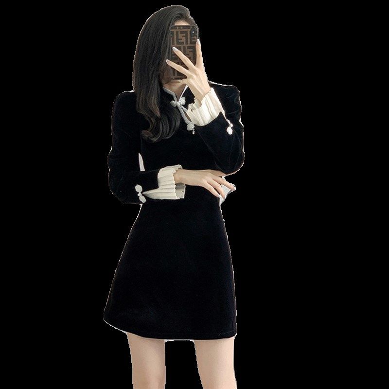 秋装新中式改良版旗袍黑色连衣裙秋冬新款中国风女装法式内搭裙子