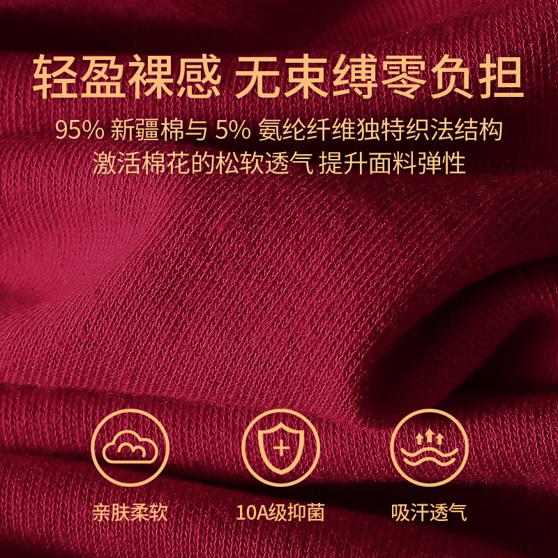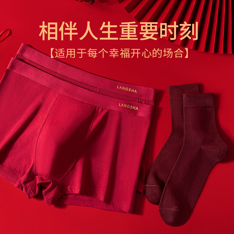 浪莎酒红色男士内裤平角裤头本命年结婚马年高档纯棉袜子四角短裤