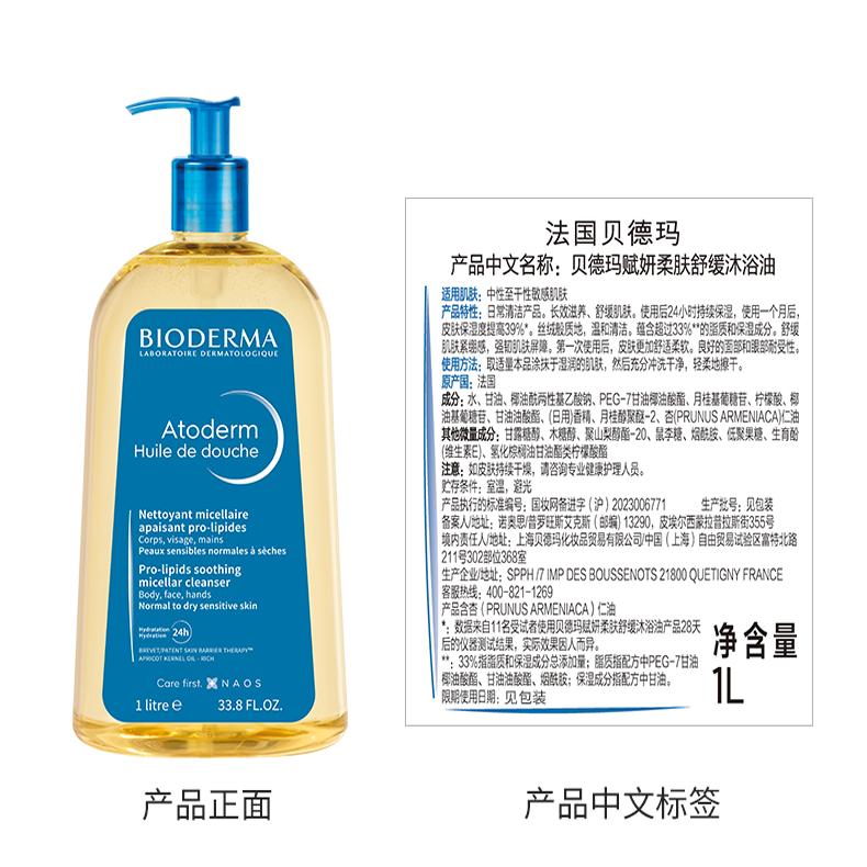 法国贝德玛赋妍柔肤舒缓沐浴油1L干敏感肌滋养保湿温和清洁旗舰店