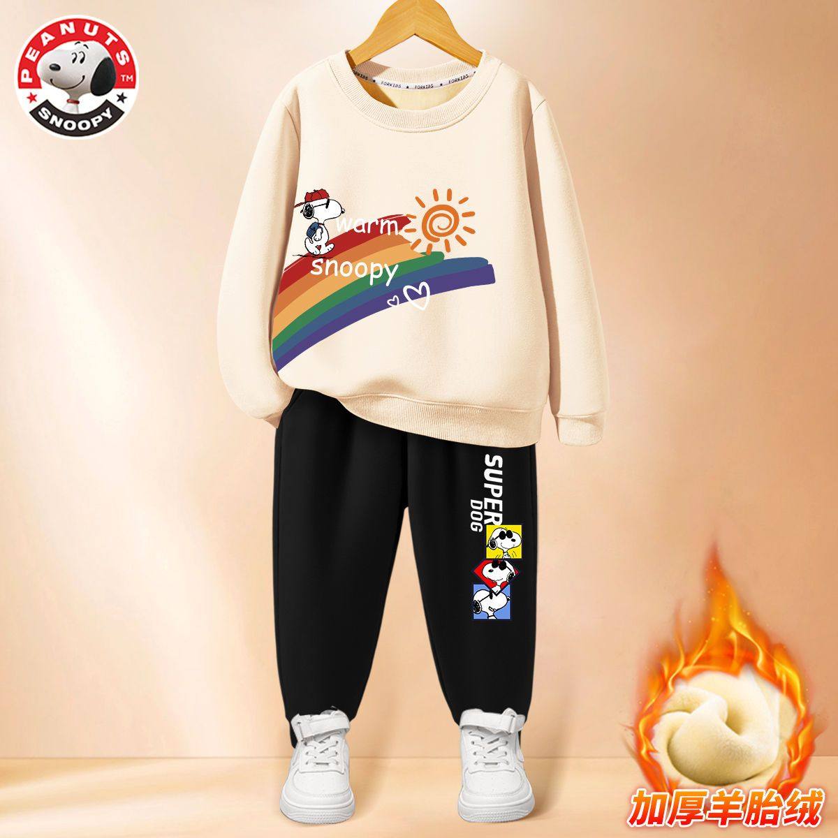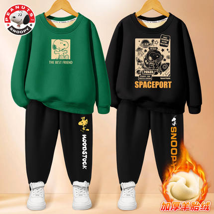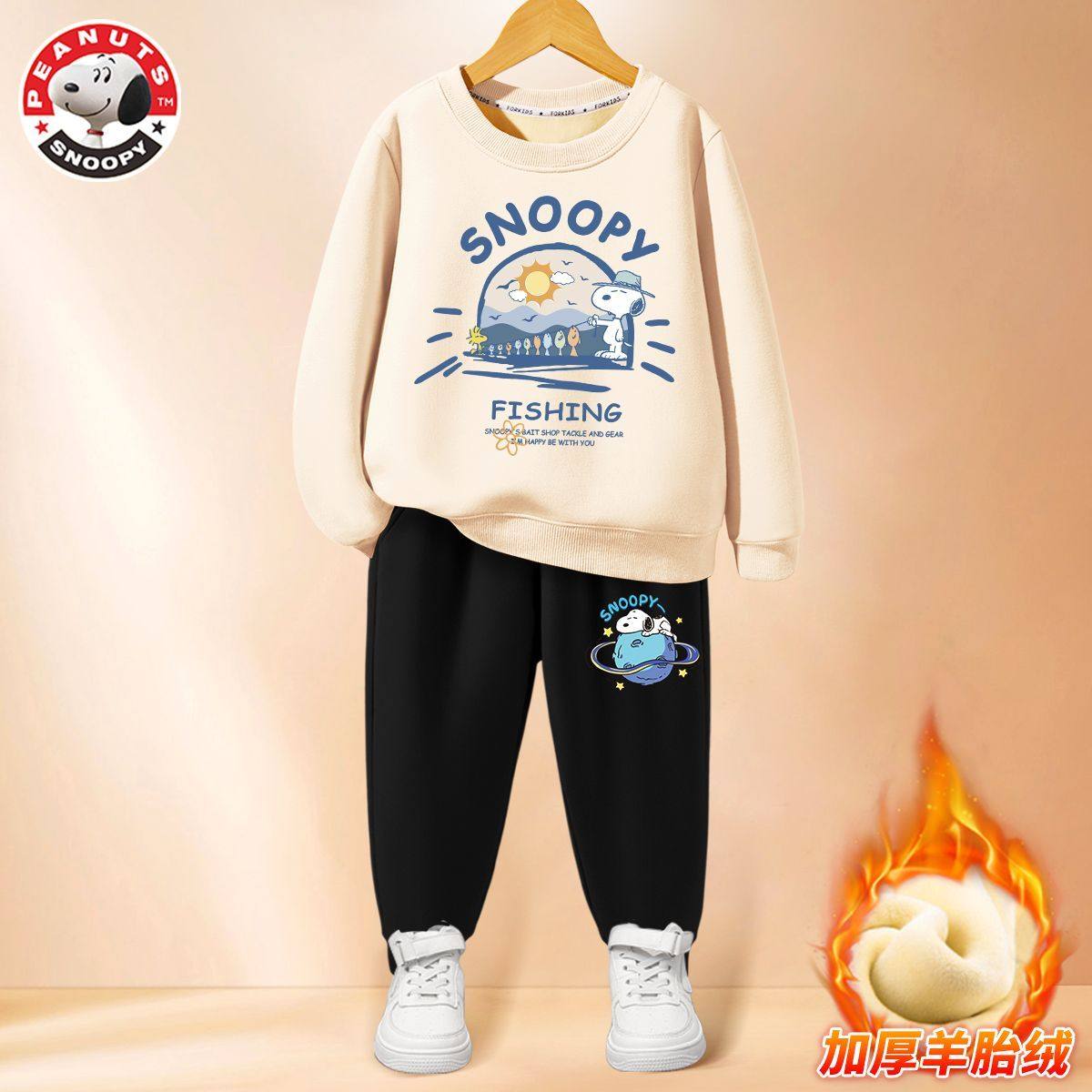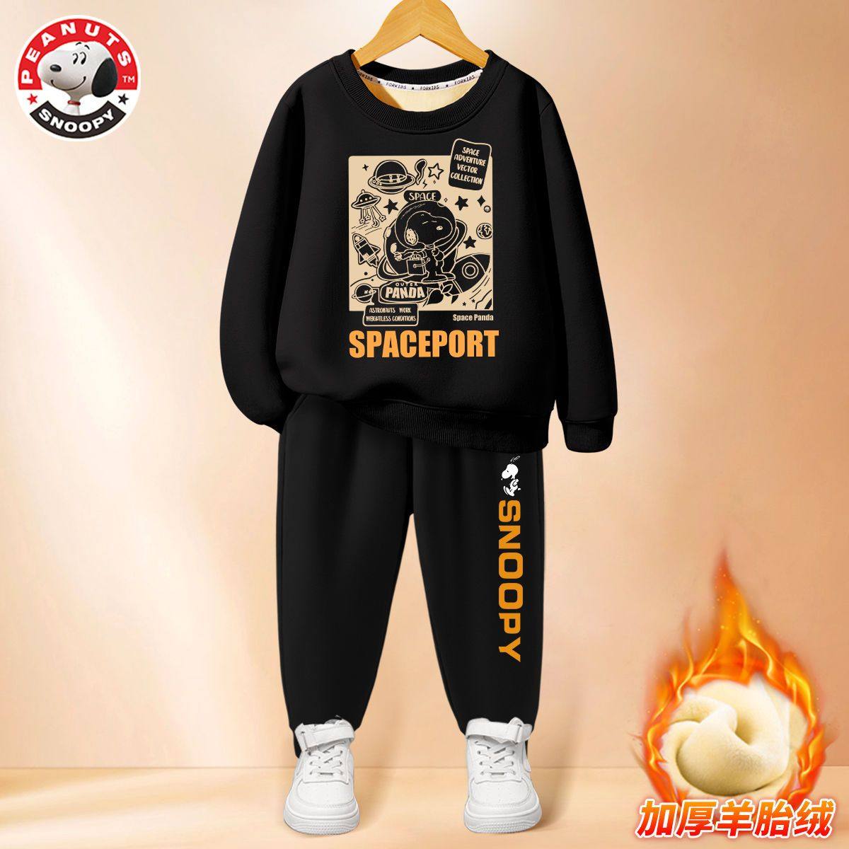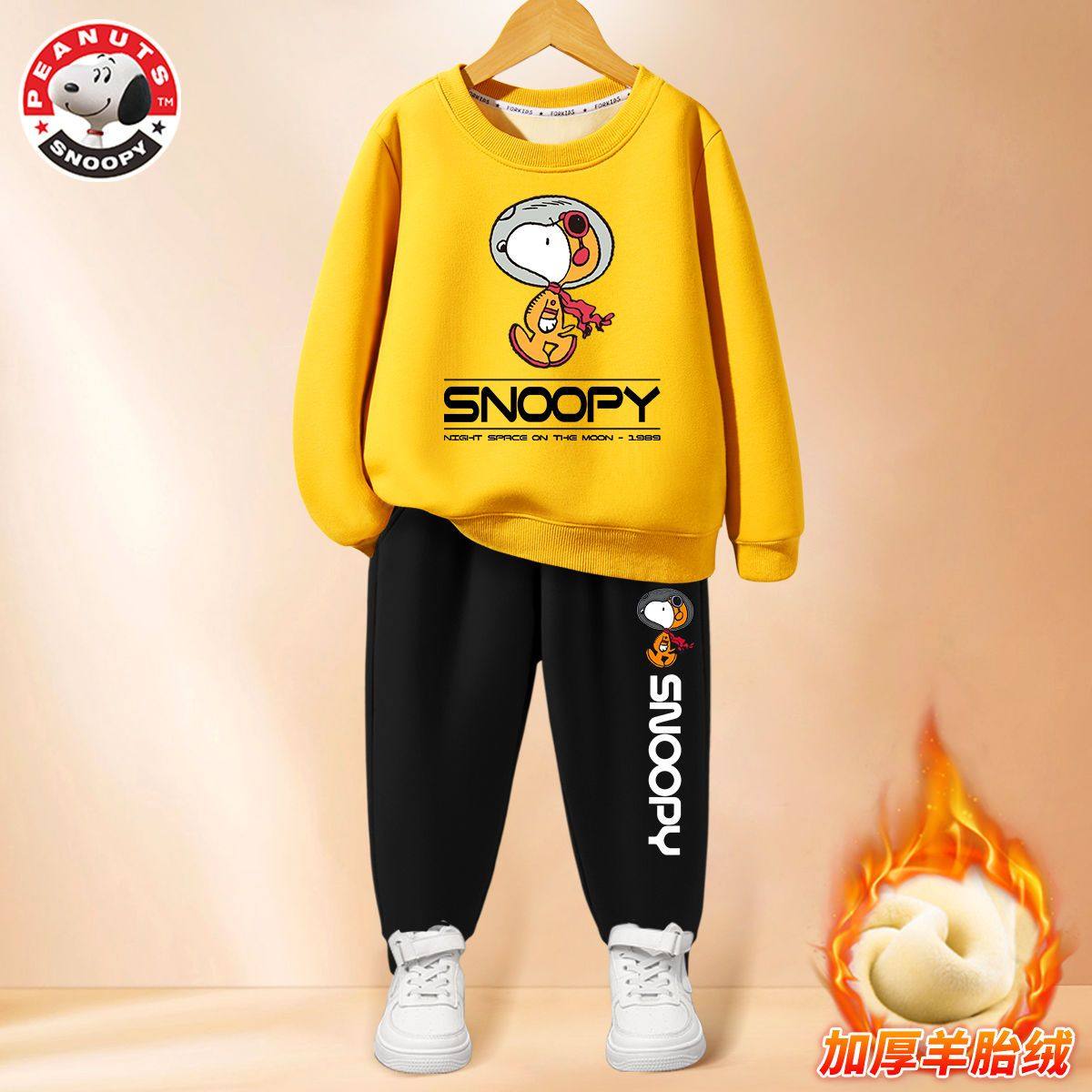 史努比中大童套装冬季一整套儿童加绒卫衣一体绒加厚男童棉裤新款