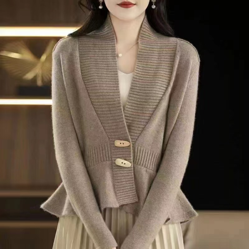 V领复古简约毛衣牛角扣木耳边外套修身显瘦气质有色绵羊绒开衫女