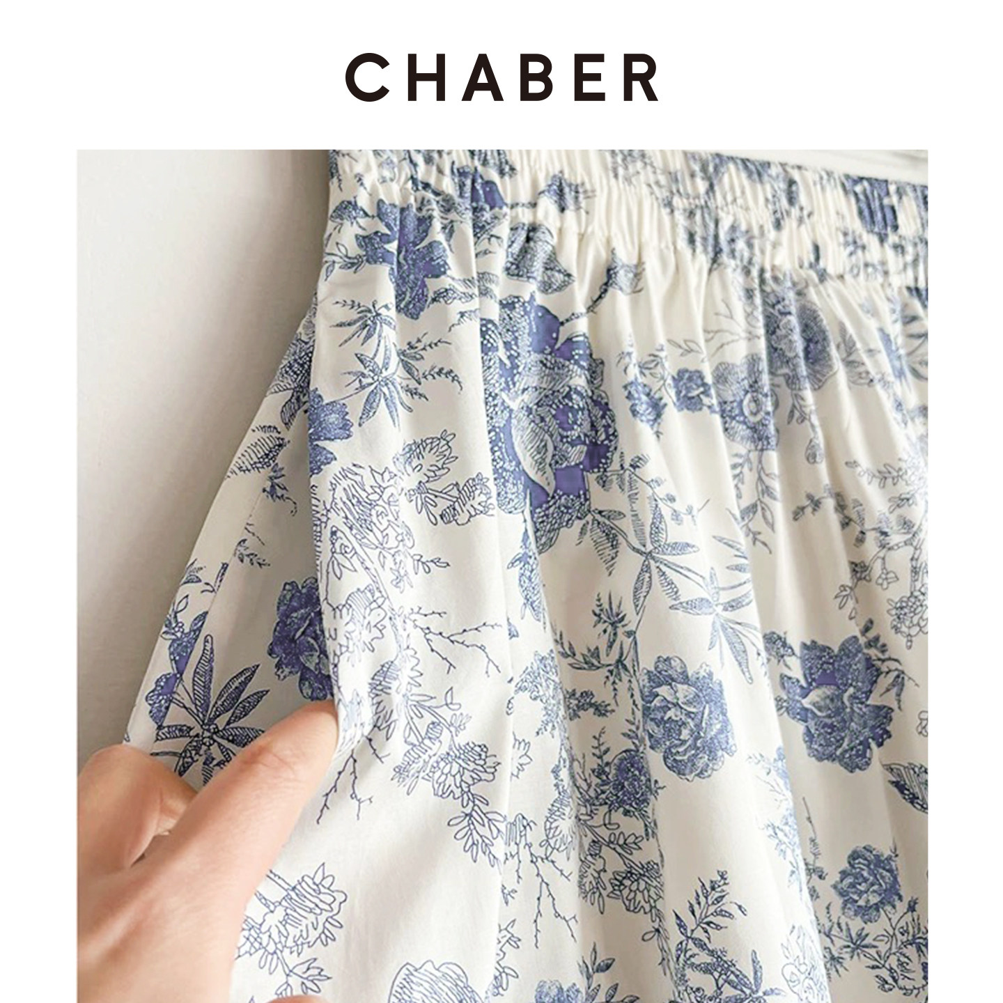 chaber巧帛夏季新款松紧腰印花棉裙子时尚减龄甜美气质A字半身裙