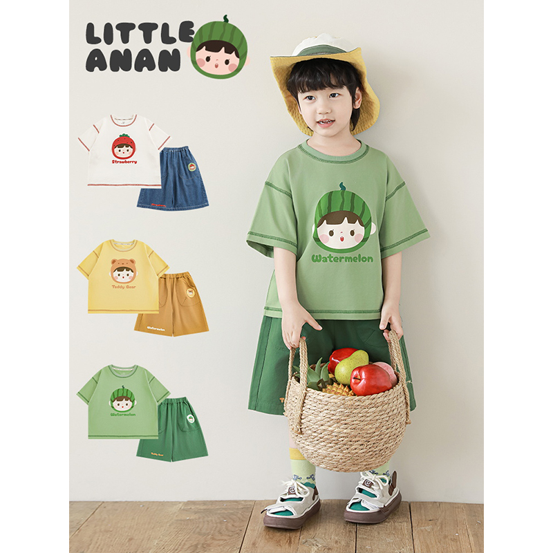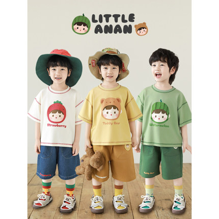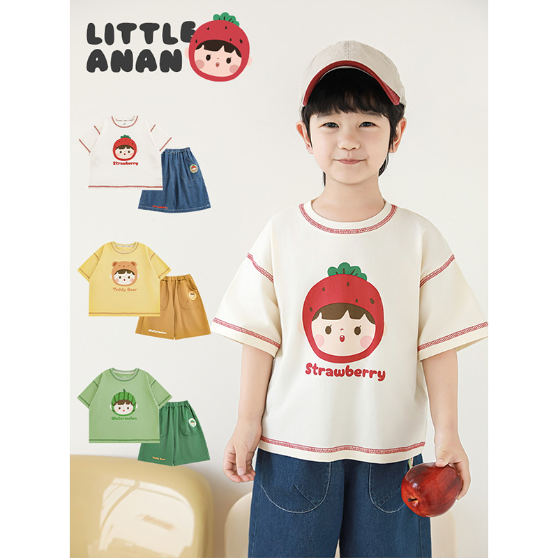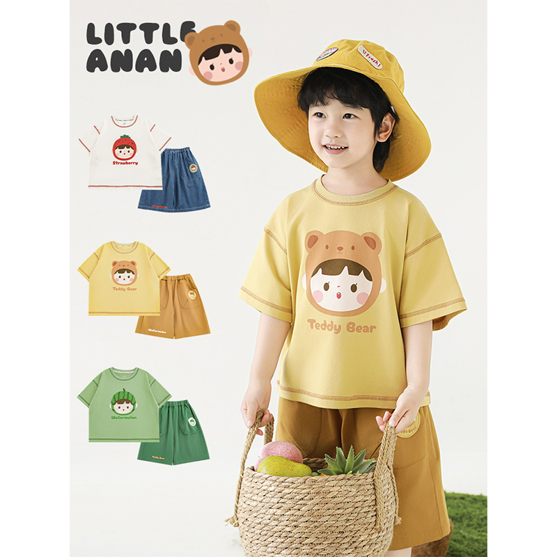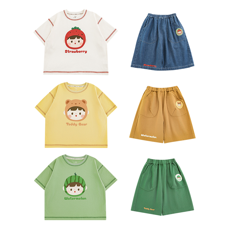 幼悠 男童2025夏季新款水果小熊短袖t恤轻薄透气宽松短裤儿童套装
