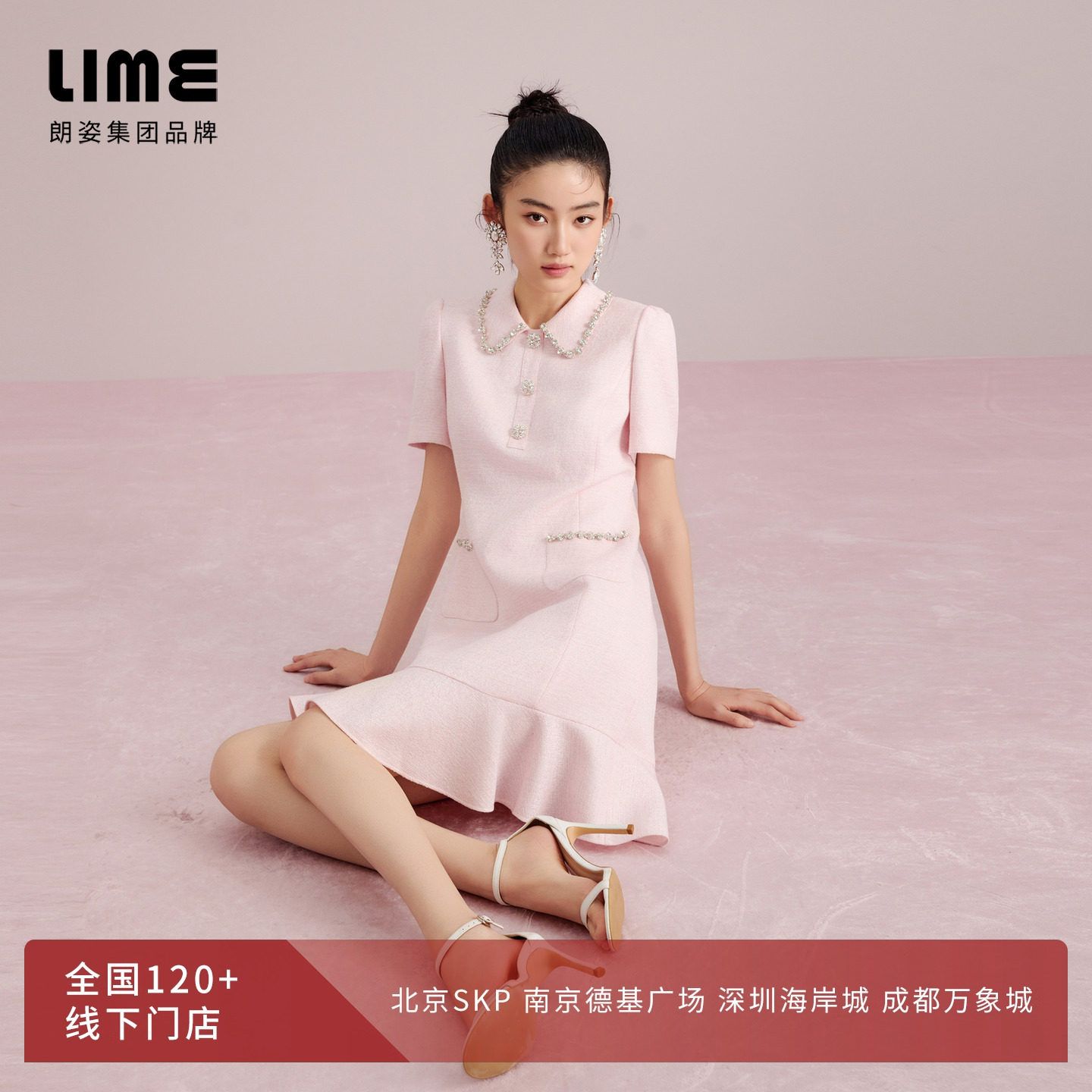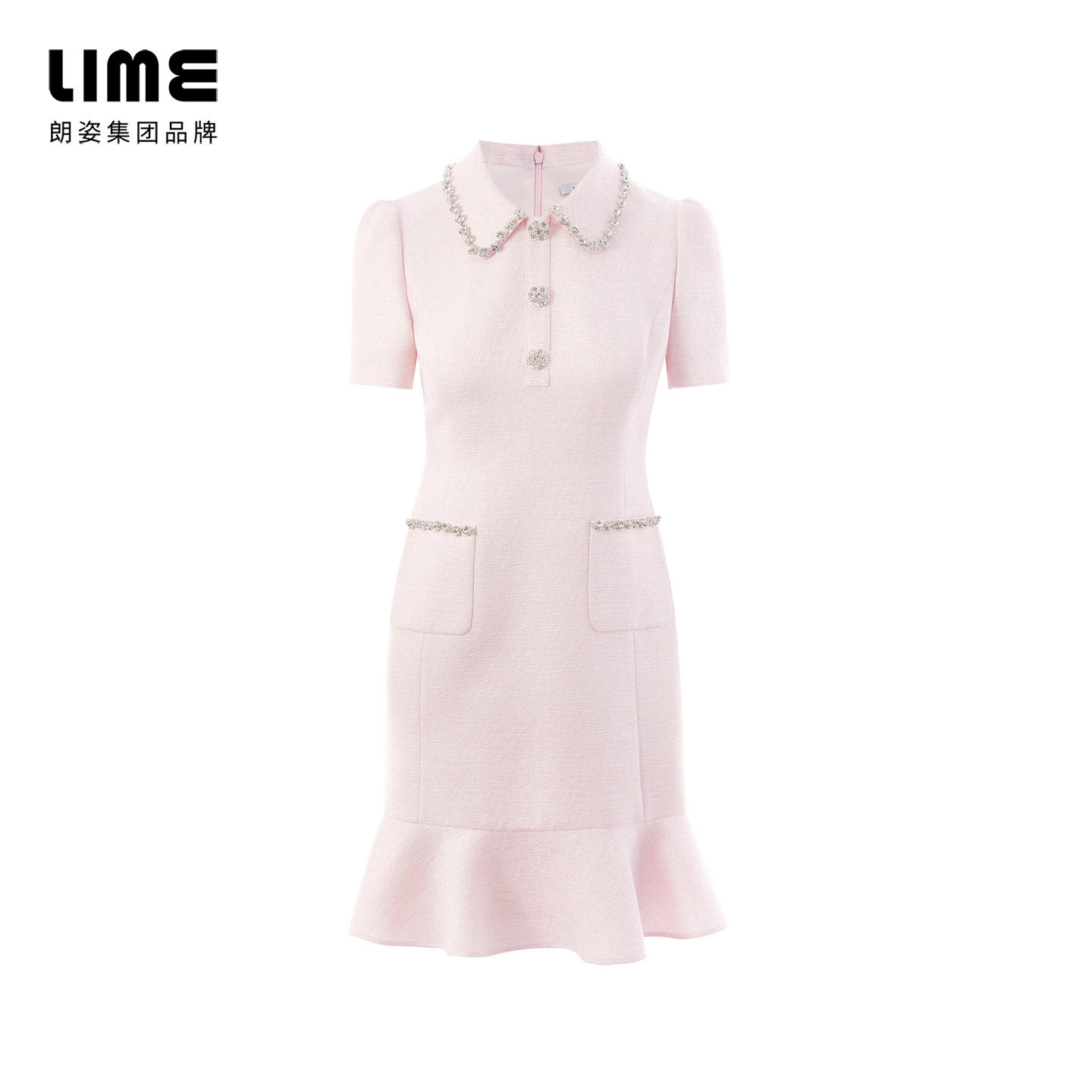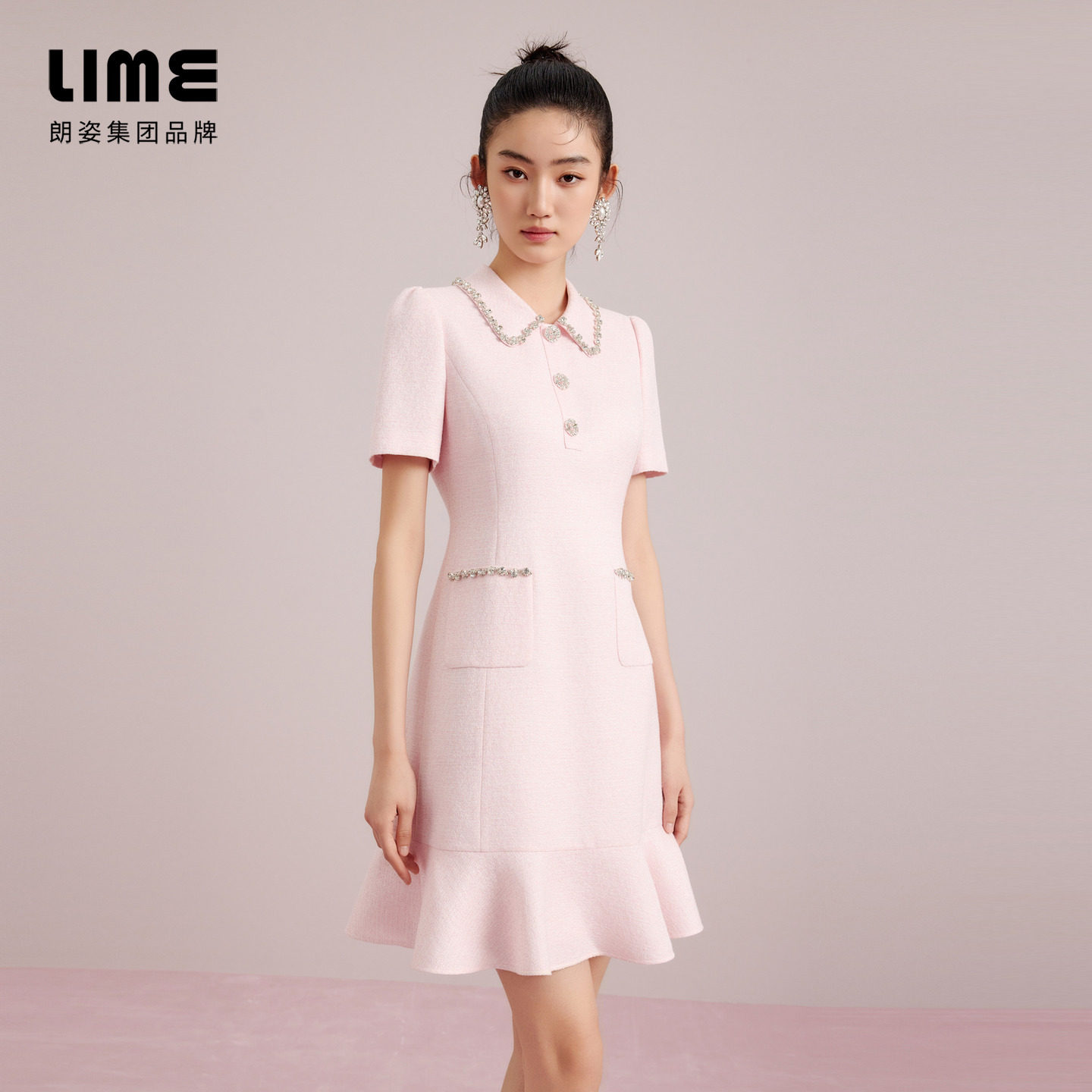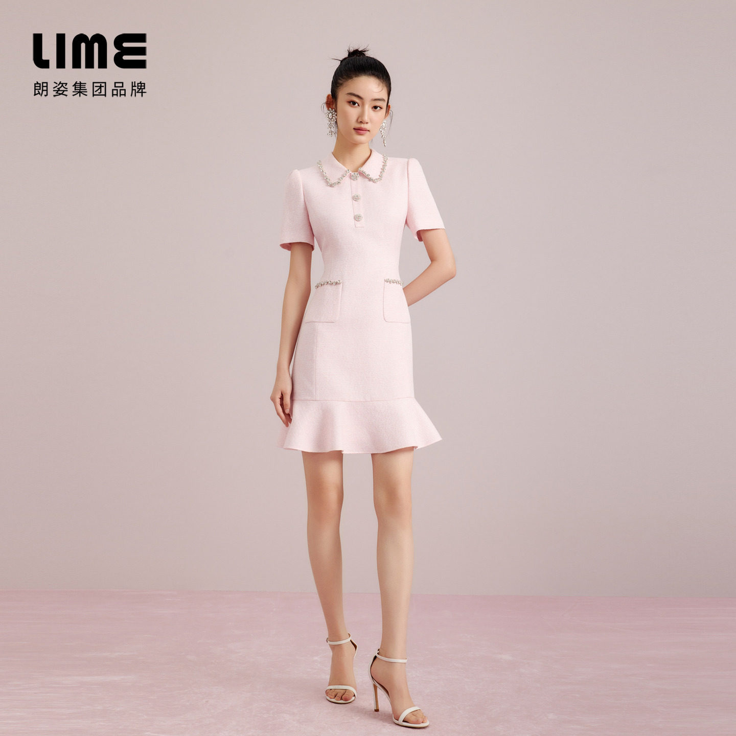 朗姿集团LIME莱茵小香风连衣裙Miu风淡粉色新款鱼尾下摆裙场合裙