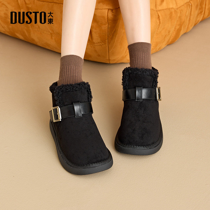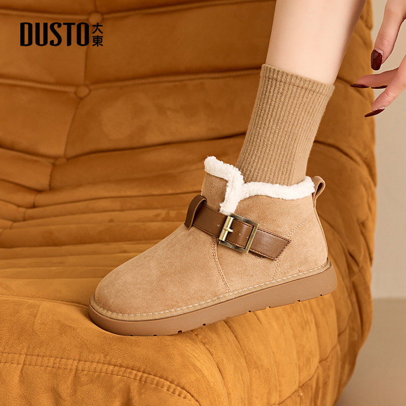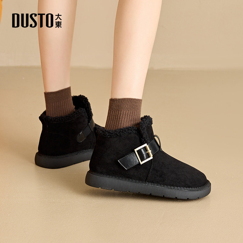 大东女靴雪地靴2025冬季新款加绒保暖棉鞋平跟厚底皮带扣圆头短靴
