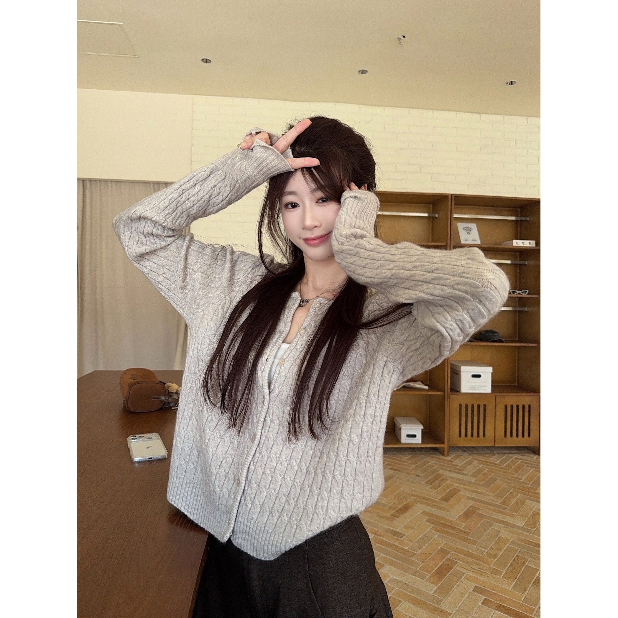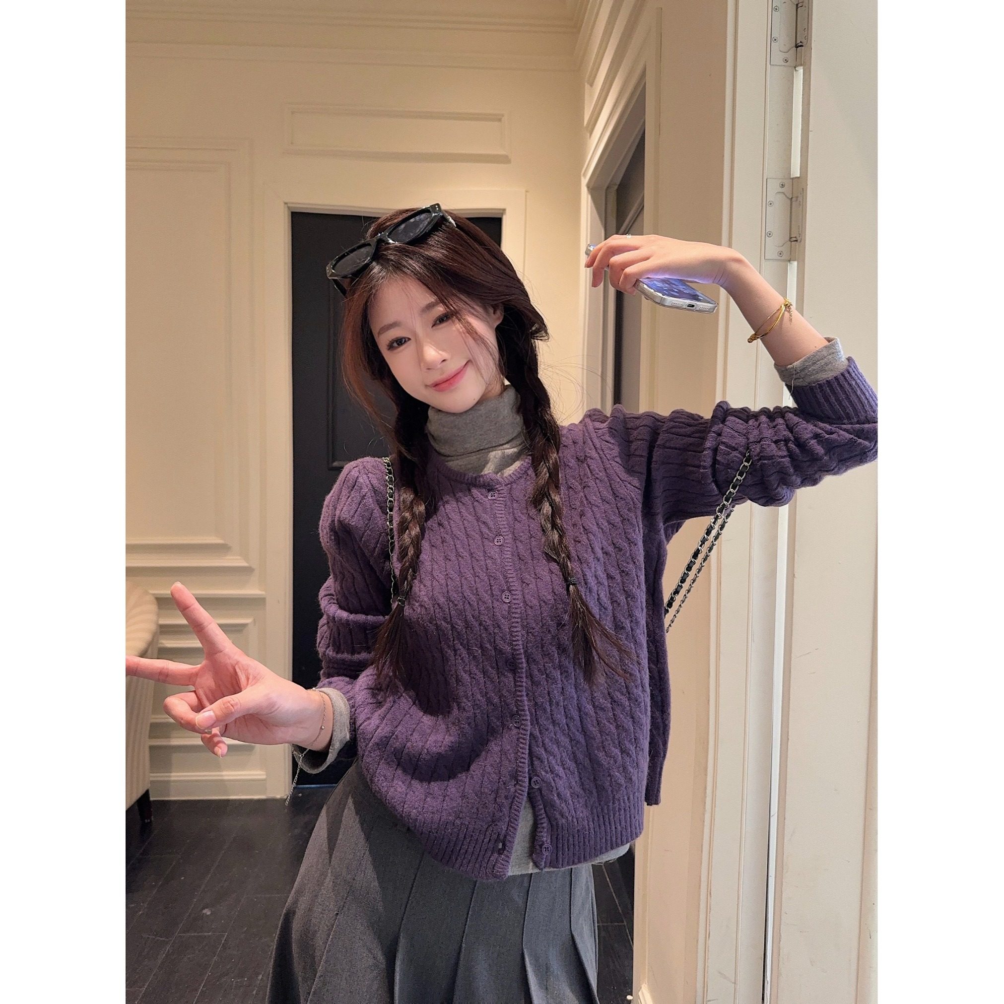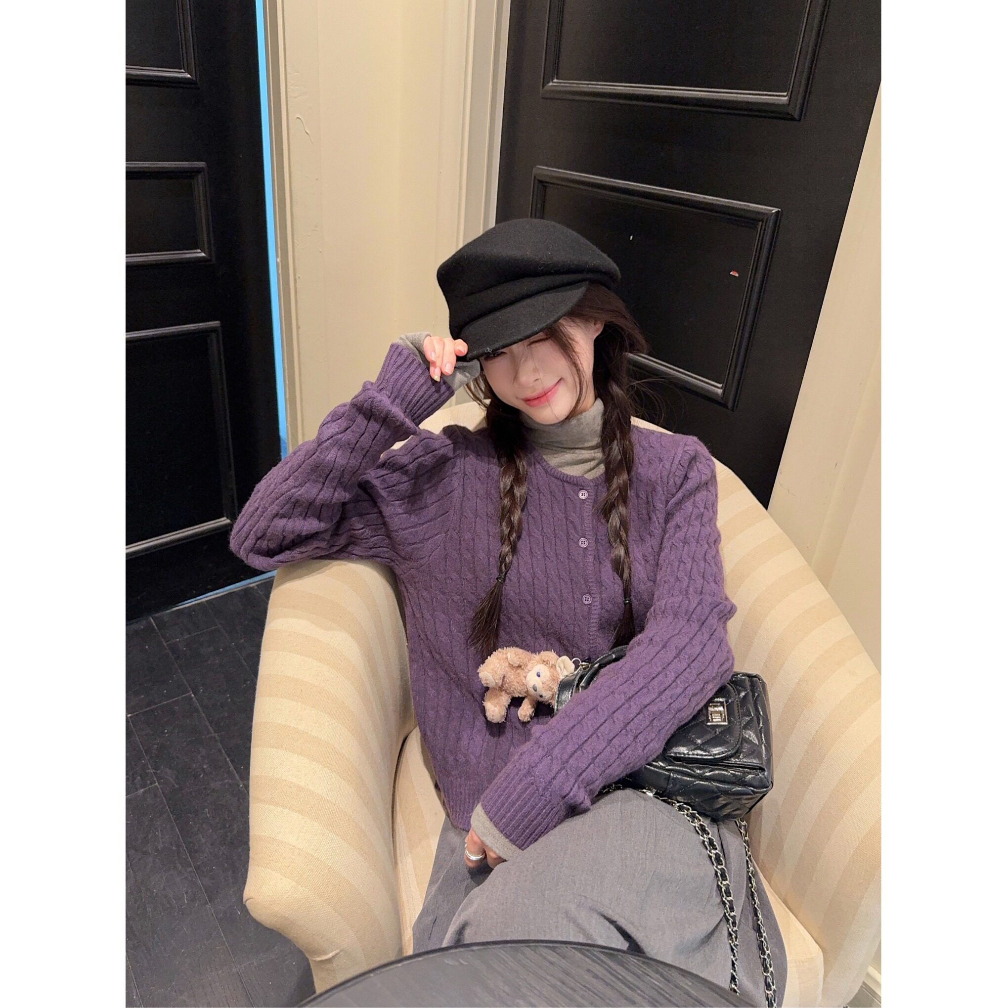 高级感紫色韩系针织开衫女秋冬气质显瘦百搭慵懒宽松毛衣外套上衣
