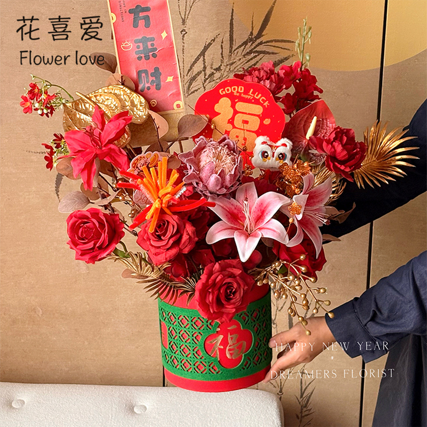 花喜爱新年窗花圆盒福桶鲜花束