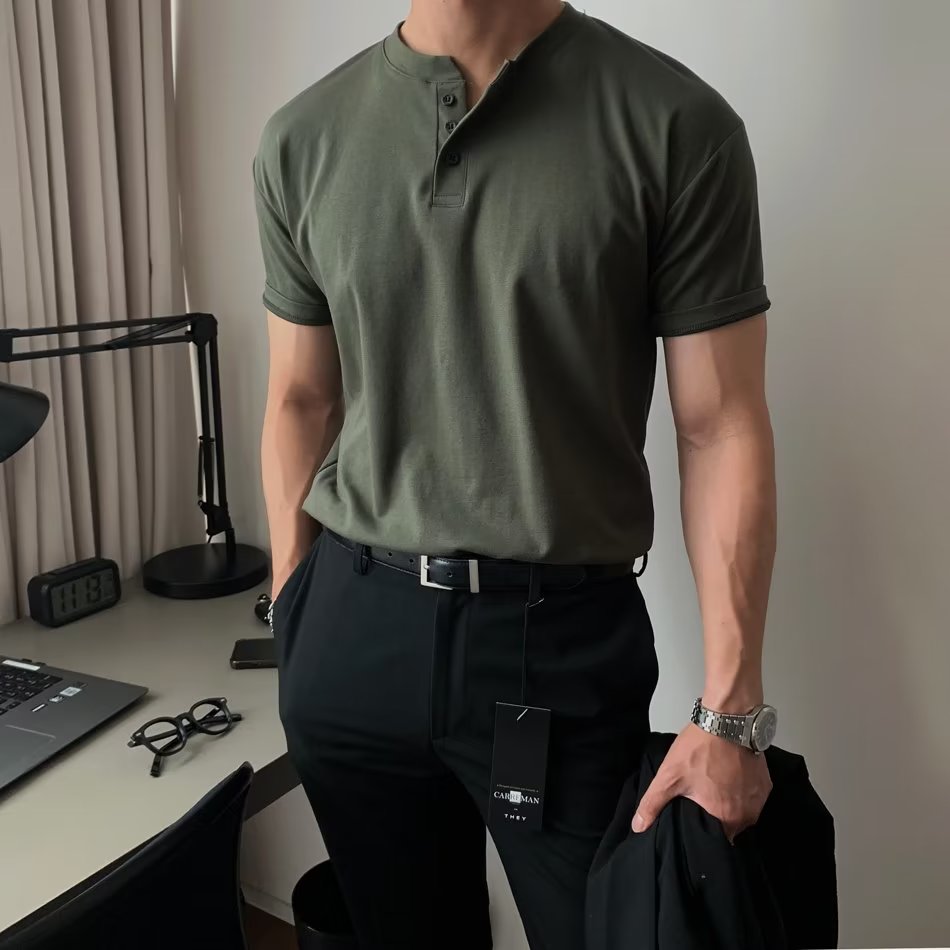 美式亨利领t恤男高级感纯棉修身短袖半开襟圆领上衣全棉透气体恤