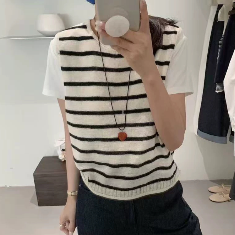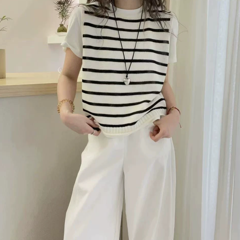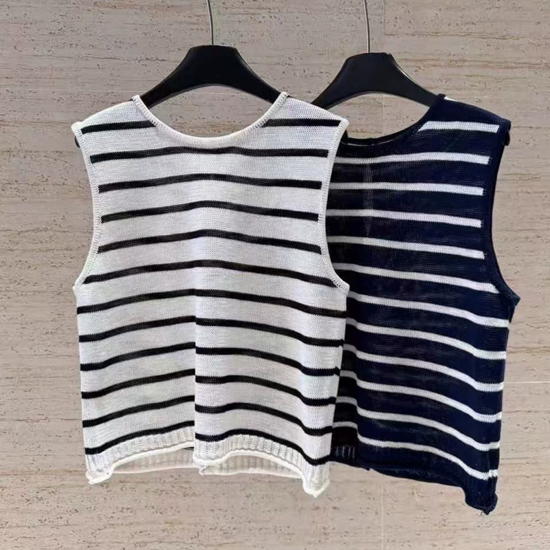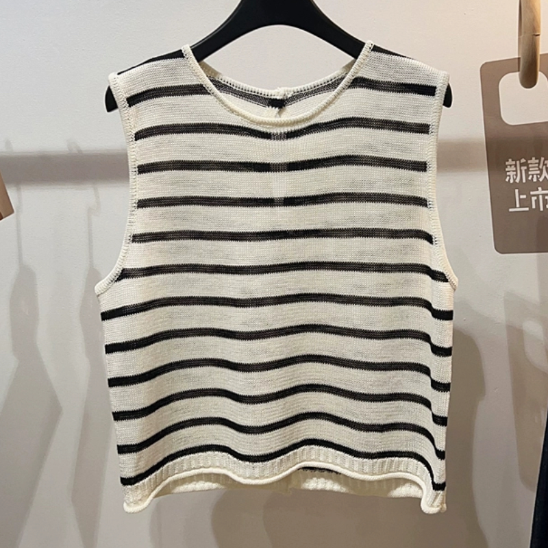 A804时髦圆领轻薄透气条纹针织背心女夏季设计感无袖叠穿上衣
