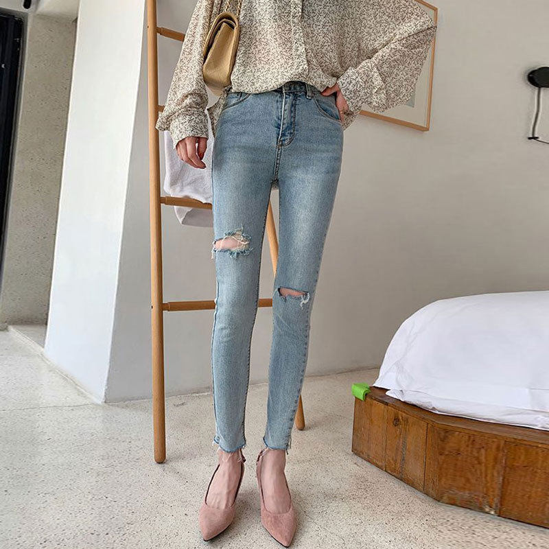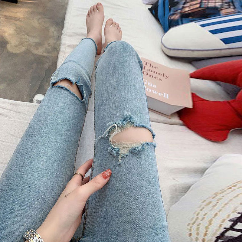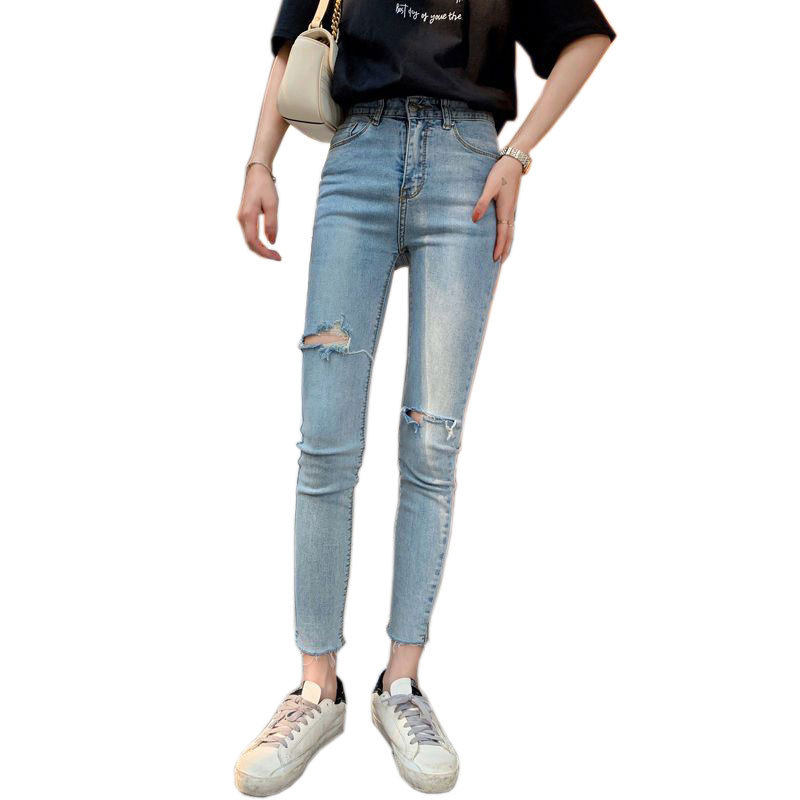 浅色破洞牛仔裤女薄款春夏弹力紧身小脚裤修身时尚九分铅笔裤子潮