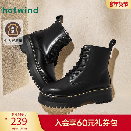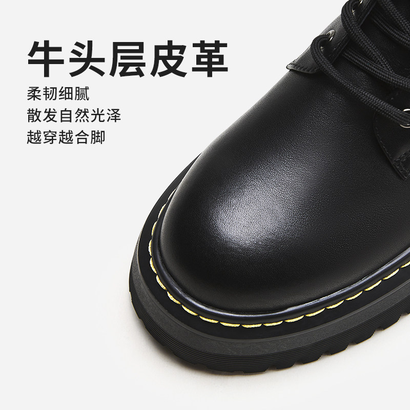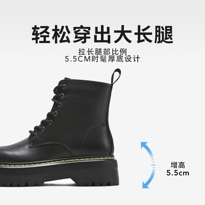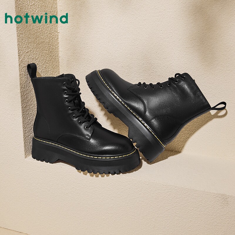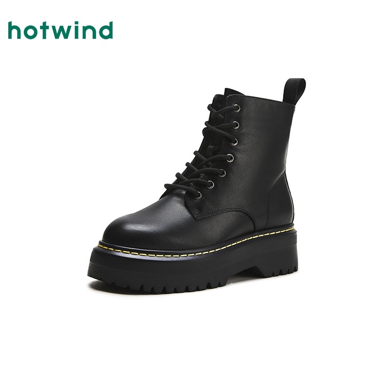 热风秋季新款女士经典百搭厚底黑色马丁靴圆头系带靴子女靴